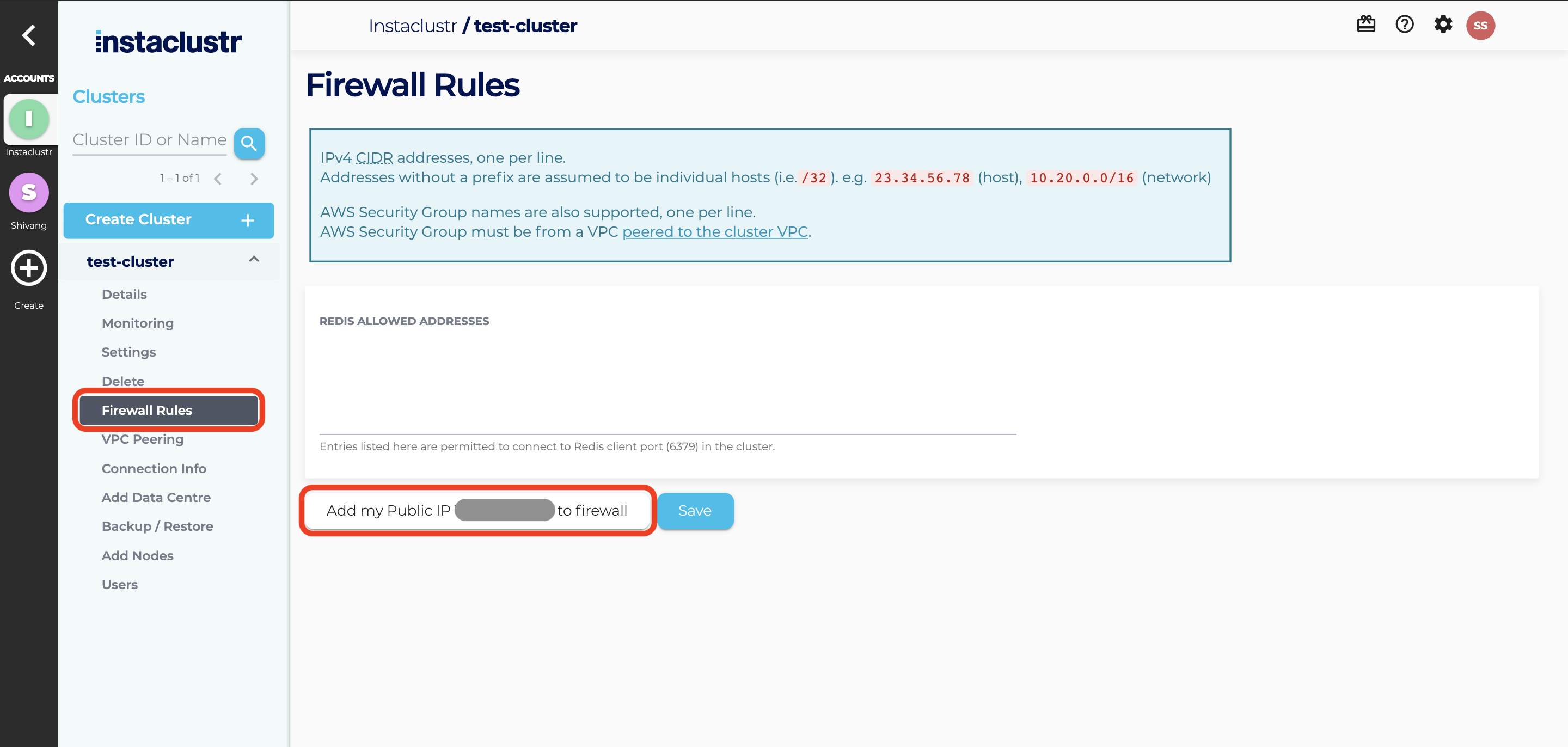 Enter any additional IP addresses you wish to trust to the Redis Allowed Addresses list. If your cluster is running on AWS and clients are connecting using VPC peering, then you may also add one or more AWS security groups to the list. Click Add my Public IP to firewall to add your public IP address to the cluster firewall and then Save to save your changes.