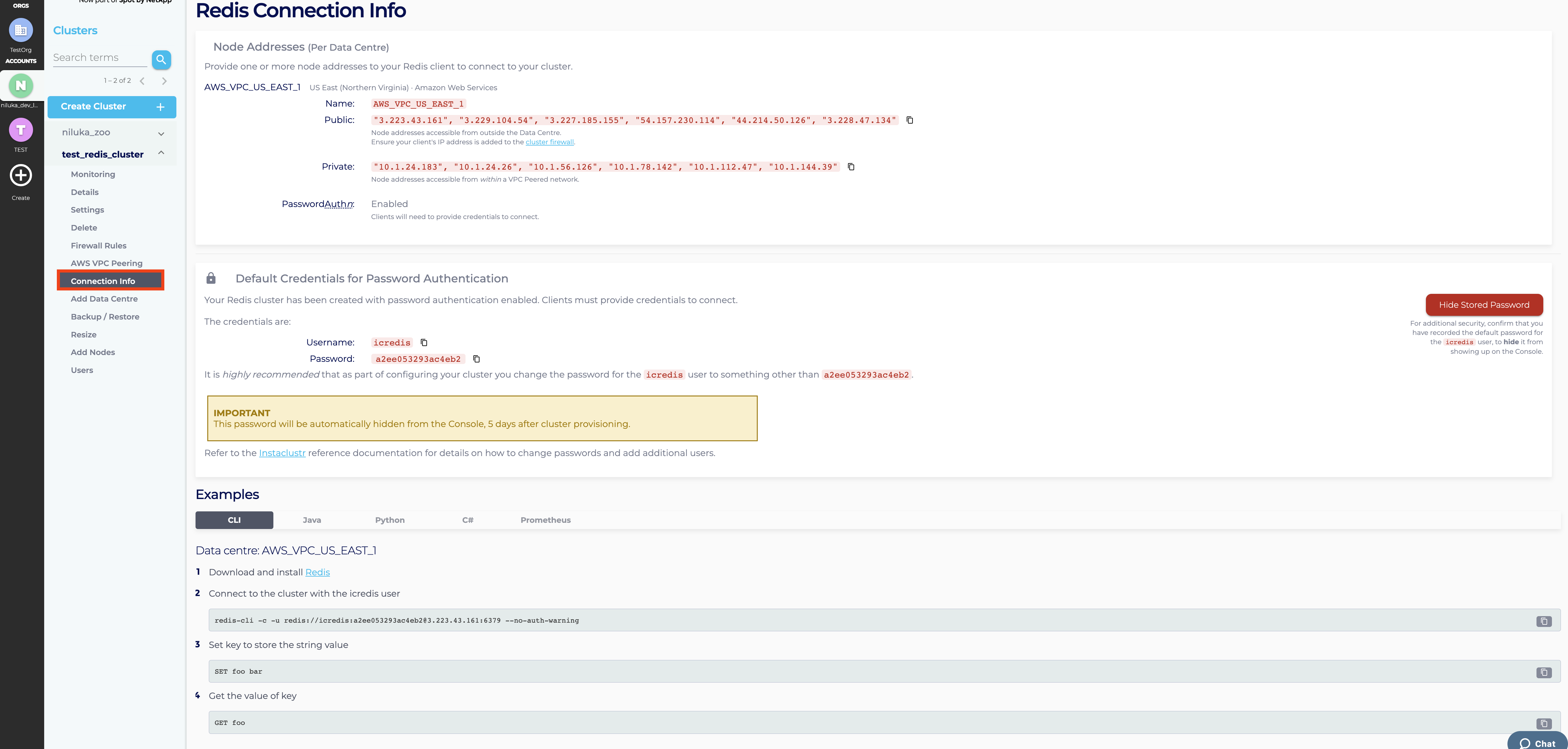 - Instaclustr provides connection information and examples on the Connection Info page which can be accessed by clicking Connection Info from the side bar. The Connection Info page contains a list of your node addresses and a few connection examples for popular clients Redis supports. If your cluster was created with Password Authentication and User Authorization, you would be able to access the credentials of the icredis user from this page. We recommend that you change the password for the icredis user at your earliest convenience. Hiding the password will not affect the actual password in the redis instance. You could reset the password for the icredis user from the Users page. The password for the icredis user will be hidden from this page,