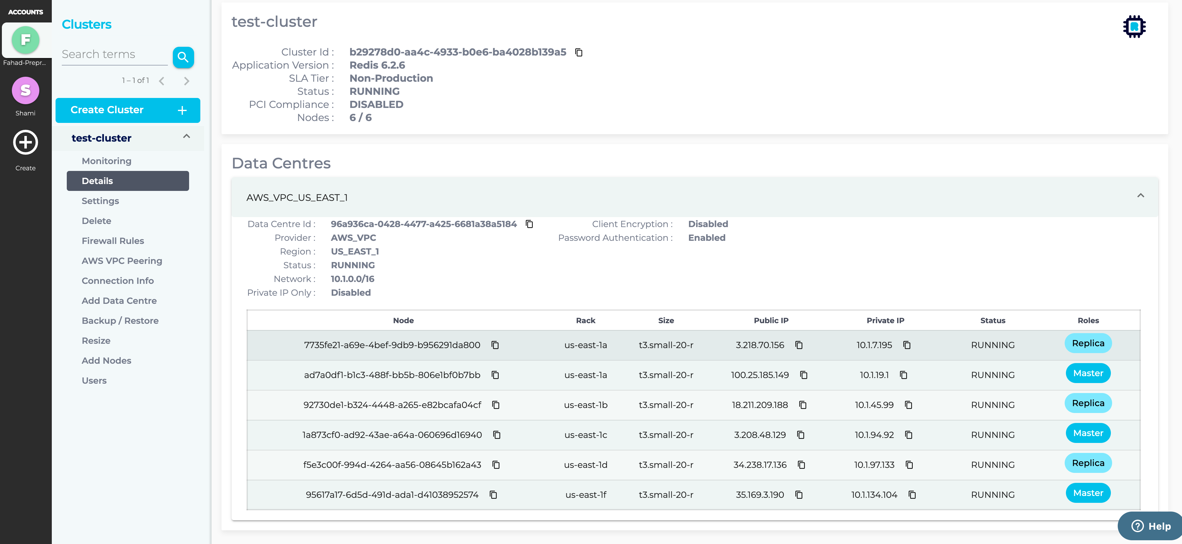 - After your Cluster has finished provisioning, navigate to your Cluster Details page. All your nodes should be in a Running state with no errors listed. Some infrastructure providers allocate both public and private (data centre local) IP addresses to cluster nodes. If both are available, they will be listed with their respective nodes on this page.