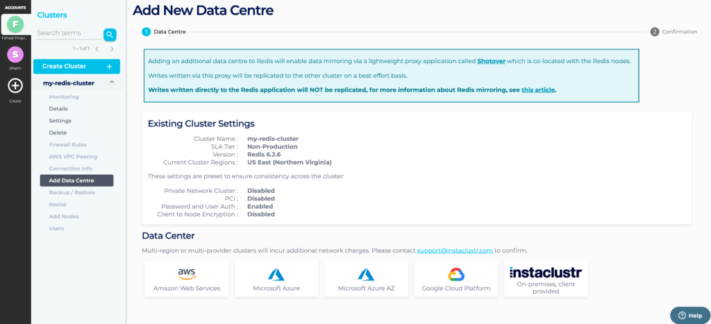 - Clicking Add Data Centre will take you to the Add Data Centre page, where you can create a new data centre for your Redis cluster by filling in the fields necessary