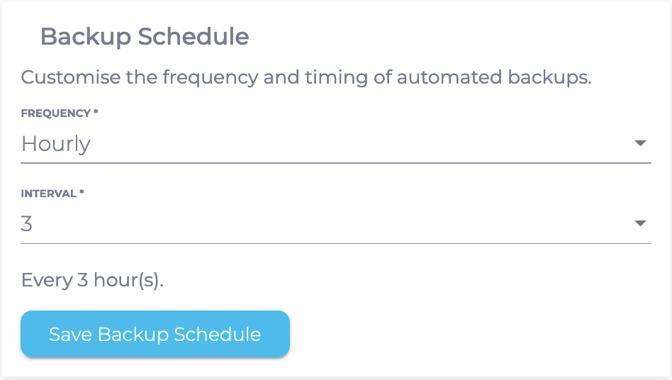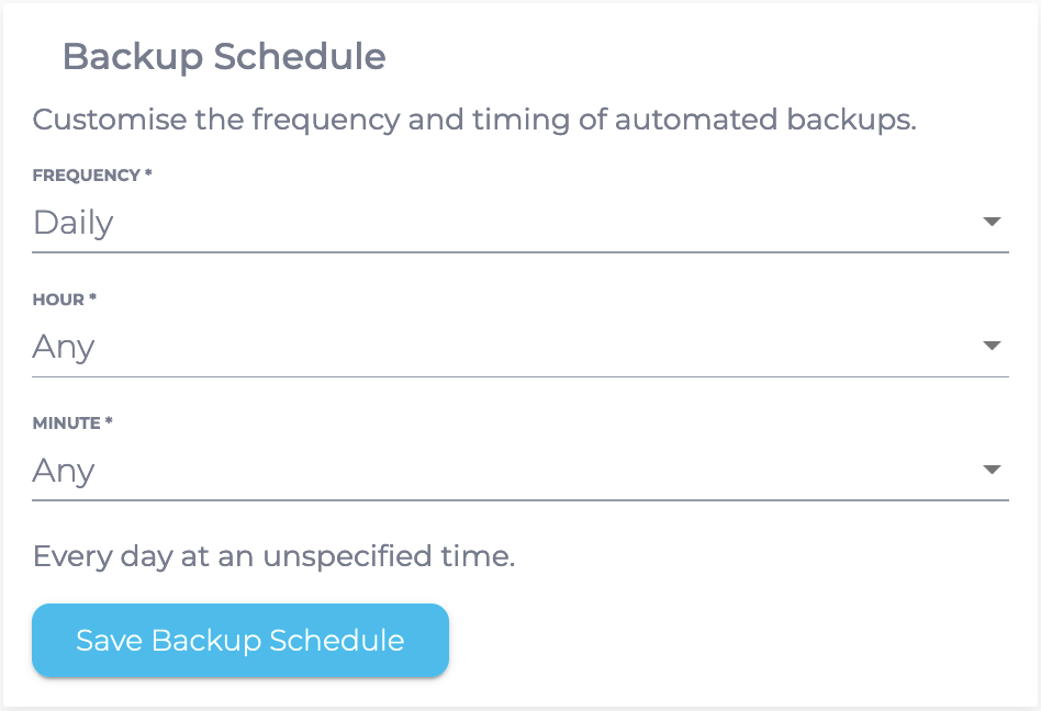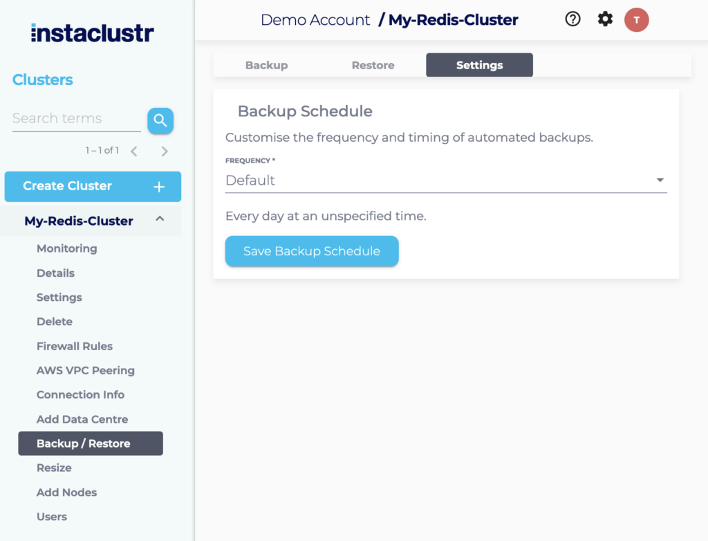 To adjust the backup frequency for your cluster, go to the Backup / Restore → Settings page. As mentioned above, the default behaviour for Redis backups is that the backup is performed once daily and held for a retention period of 7 days. You are unable to modify the trigger time for the backup while using the Default Frequency option.