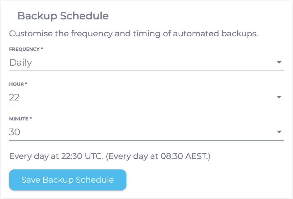 A specific UTC time can be picked for the daily backup option. The local time is also displayed for your convenience, but the schedule runs to UTC time so it is not affected by changes like daylight savings.