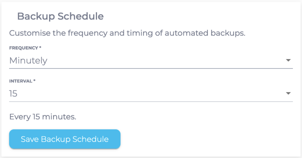 The minutely frequency supports intervals of 5, 6, 10, 12, 15, 20, 30 (divisors of 60). Please note that smaller backup intervals can adversely affect cluster performance if the cluster is already under heavy load.