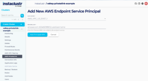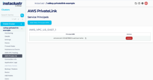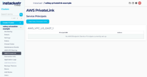 This article describes how to manage AWS Endpoint Service Principals for PrivateLink clusters using the Instaclustr Console. Amazon Resource Names (ARNs) uniquely identify AWS resources. AWS principals, such as AWS accounts, IAM users, and IAM roles can be used to allow a connection from your endpoint to a PrivateLink cluster’s endpoint service privately. Refer to our article on PrivateLink to learn more about the details of the feature, and our support for it. Our interface for the AWS Endpoint Service Principals provides the following functions: