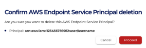 - To remove an existing Principal ARN, locate its row in the table and click on the Delete button in the Actions column alongside it. A dialog box will appear where you can confirm your removal of the Principal ARN. Click on Proceed to remove the Principal ARN.