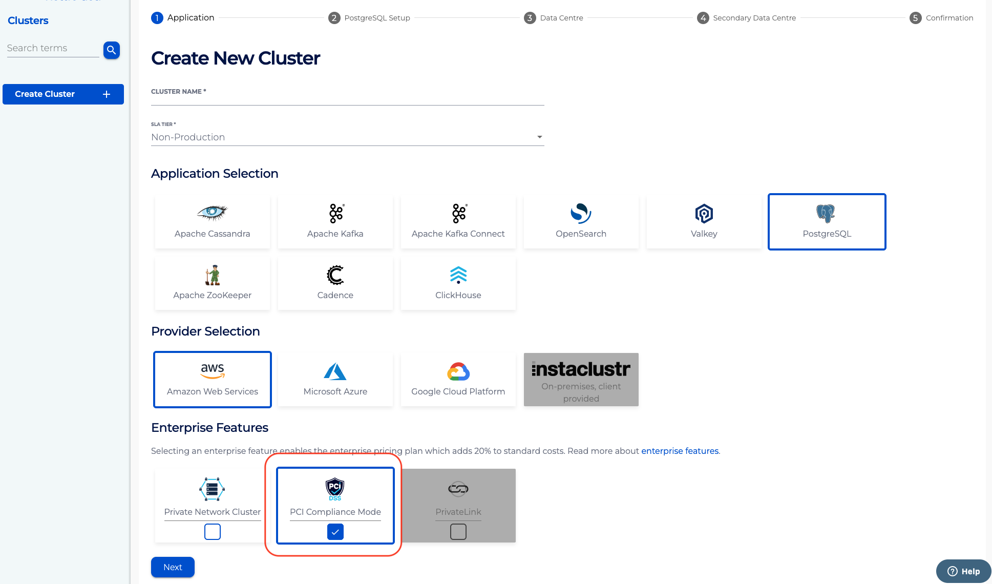 Navigate to the Create Cluster wizard and create a cluster according to your requirements but be sure to enable the PCI Compliance Mode checkbox under Enterprise features. You can refer to our support article on Creating a PostgreSQL Cluster for more information.