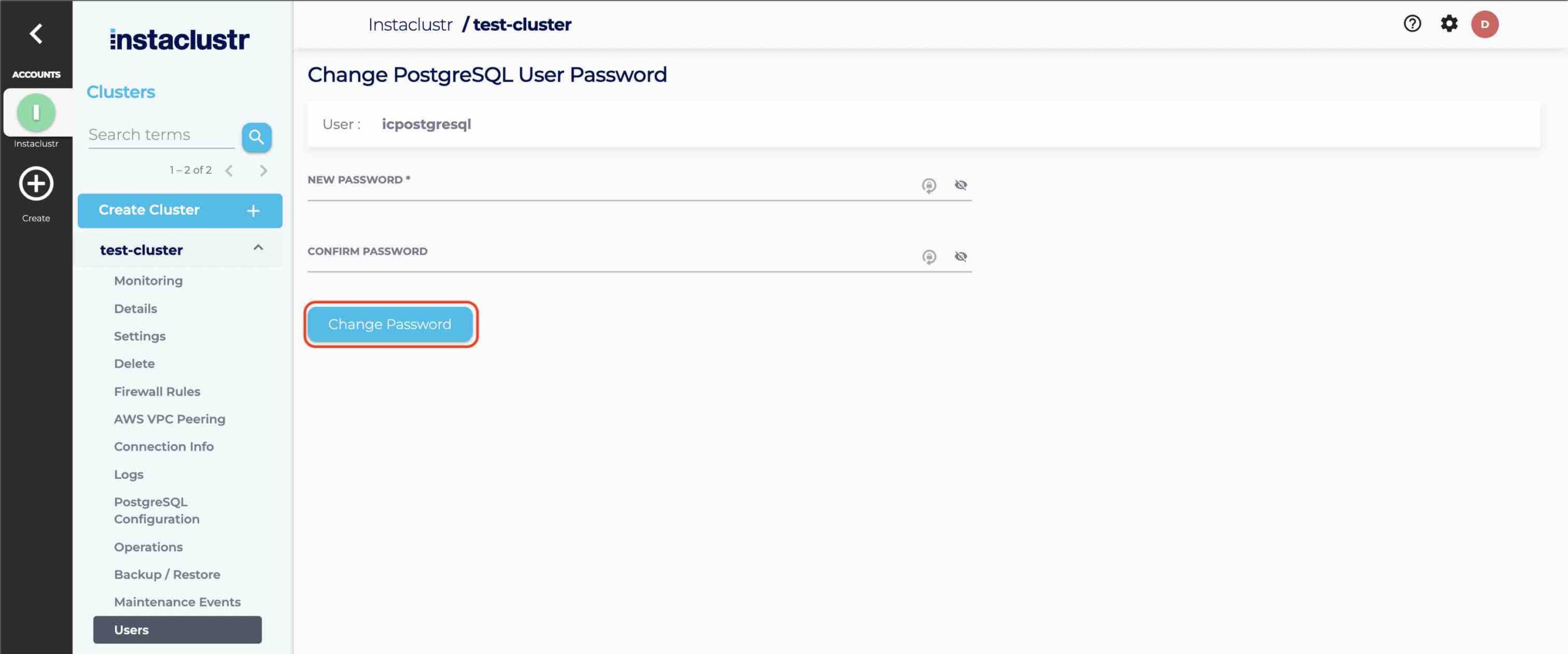 - To change the password of the default PostgreSQL user, first, navigate to the Users page of your PostgreSQL cluster. From the Users page, click the Change Password button of the default user. You will be redirected to the form for changing your password.