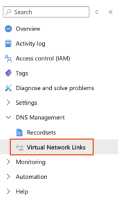 - Navigate to DNS Management -> Virtual Network Links from the menu on the left side, click Add in the page