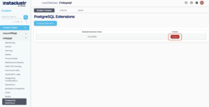 1. To disable an extension, first, navigate to the PostgreSQL Extensions page of your PostgreSQL cluster. From the PostgreSQL Extensions page, click the Disable button on the extension that you want to disable. You will be redirected to the form to disable that particular extension.