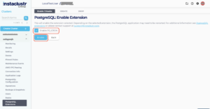 1. To enable an extension, first, navigate to the PostgreSQL Extensions page of your PostgreSQL cluster. From the PostgreSQL Extensions page, click the Enable button. You will be redirected to the form to enable available extensions.