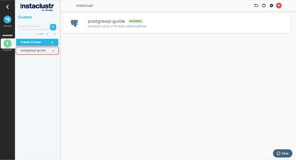 To get started, after signing into the console, click on the dropdown button with the name of the PostgreSQL cluster you want to backup. This will reveal a list of different tasks that can be conducted on the cluster