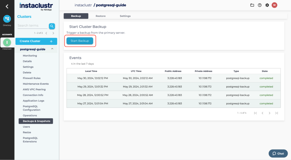 These backups are similar to full snapshots that are run daily but are instead triggered by the user. The instructions below assume that you have already provisioned a PostgreSQL cluster in accordance with the steps in Creating a PostgreSQL Cluster.