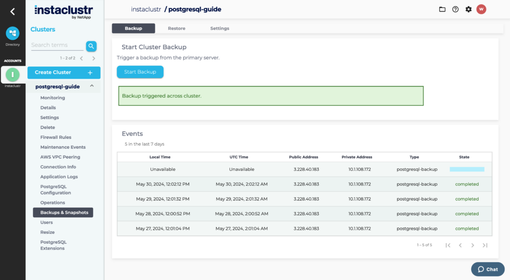 After clicking this button, a message will appear stating that a backup has been triggered. A new entry will appear in the events table with a backup completion date of Unavailable and a progress bar in the ‘State’ field. When the backup completes, the date will switch to the completion time, and the state will change to completed.