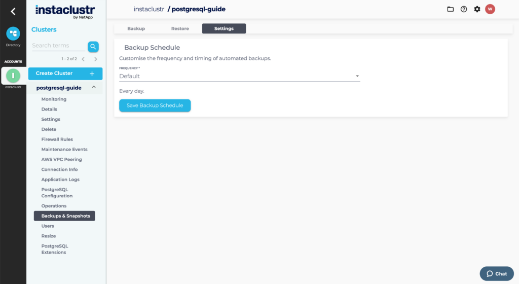 Instaclustr performs full backups daily for PostgreSQL clusters. To configure a custom backup schedule for your cluster, to ensure backups happen when suitable for you, go to the Backups & Snapshots → Settings page where you can select a backup frequency. PostgreSQL clusters only support daily frequency.
