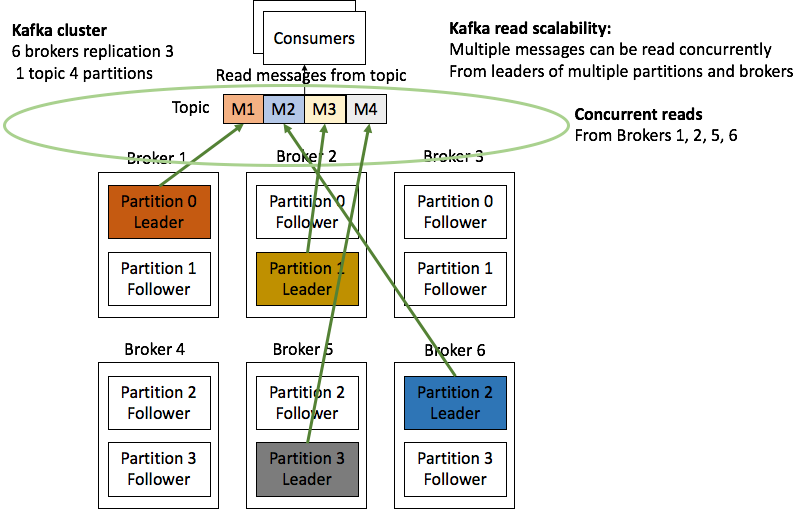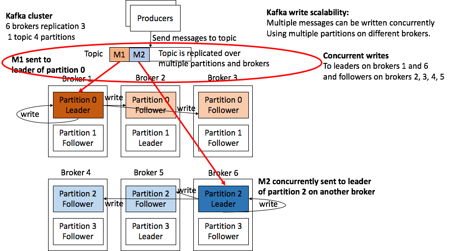 The following diagrams (from the insidebigdata series we published last year on Apache Kafka architecture) illustrate how Kafka partitions and leaders/followers work for a simple example (1 topic and 4 partitions), enable Kafka write scalability (including replication), and read scalability: