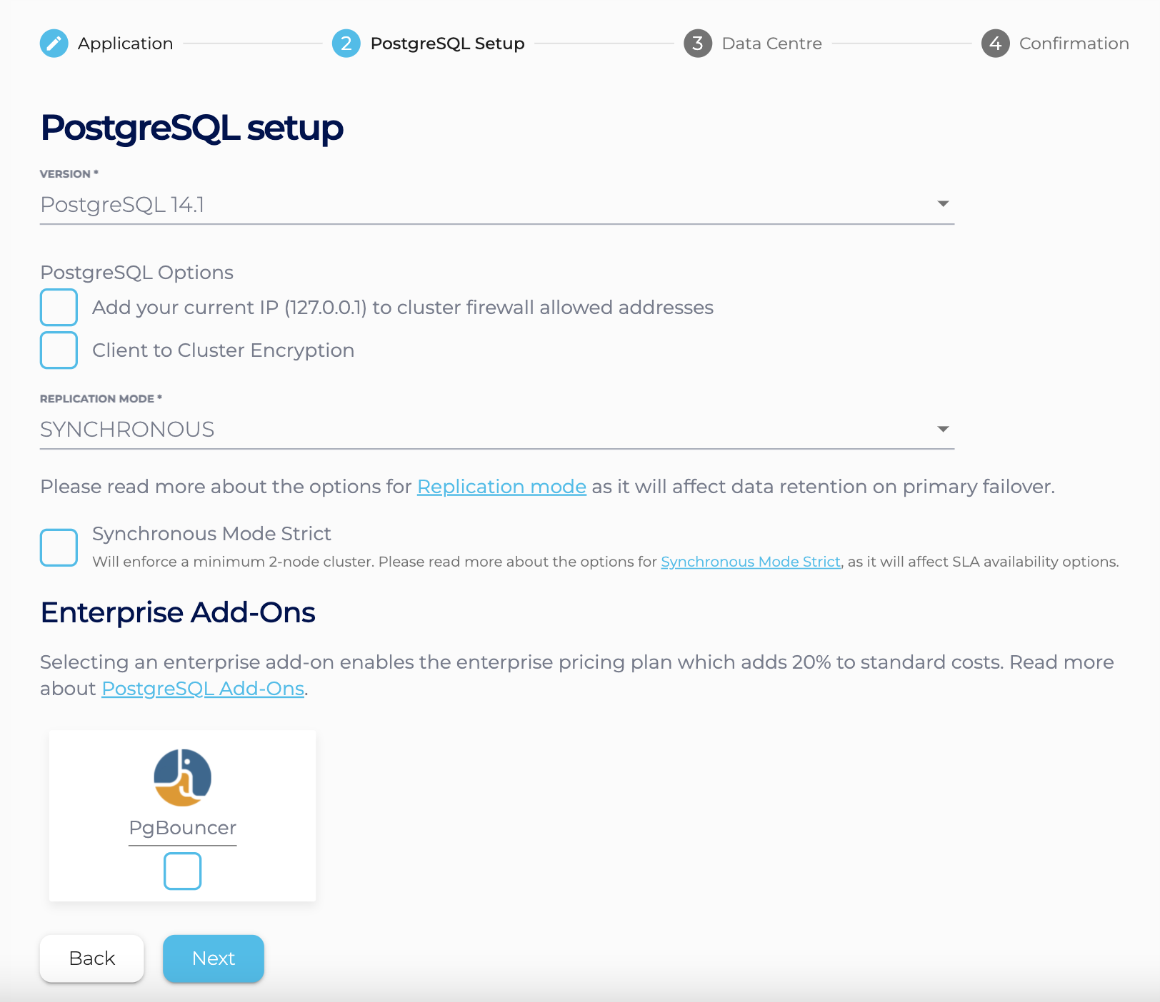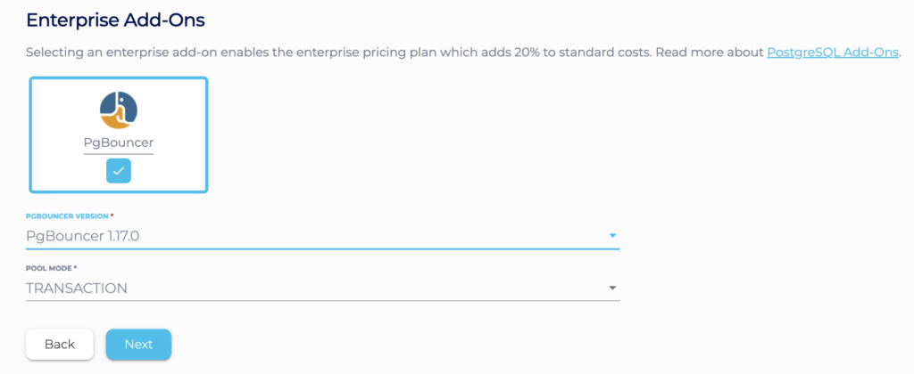 For a complete step-by-step guide on how to create a new PostgreSQL cluster, please refer to this article. When creating a PostgreSQL cluster, PgBouncer can be enabled on the ‘PostgreSQL Setup’ page in the ‘Enterprise Add-Ons sections’, as can be seen below.