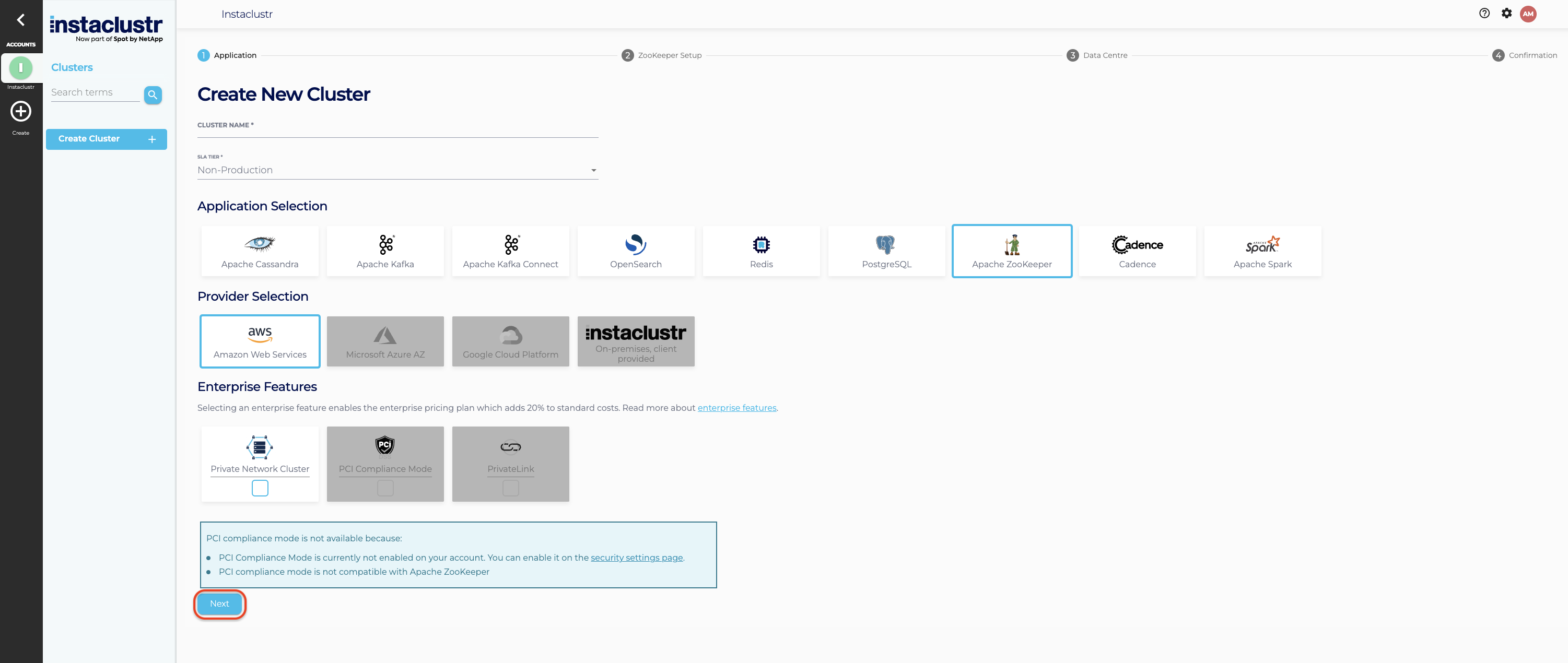 Under the Application section, enter an appropriate name for your cluster, and select ZooKeeper as your base application. Additionally, select an infrastructure provider, and add any desired Enterprise Features. You will be able to customise specific configurations matching your performance and pricing requirements in the following sections of the wizard.