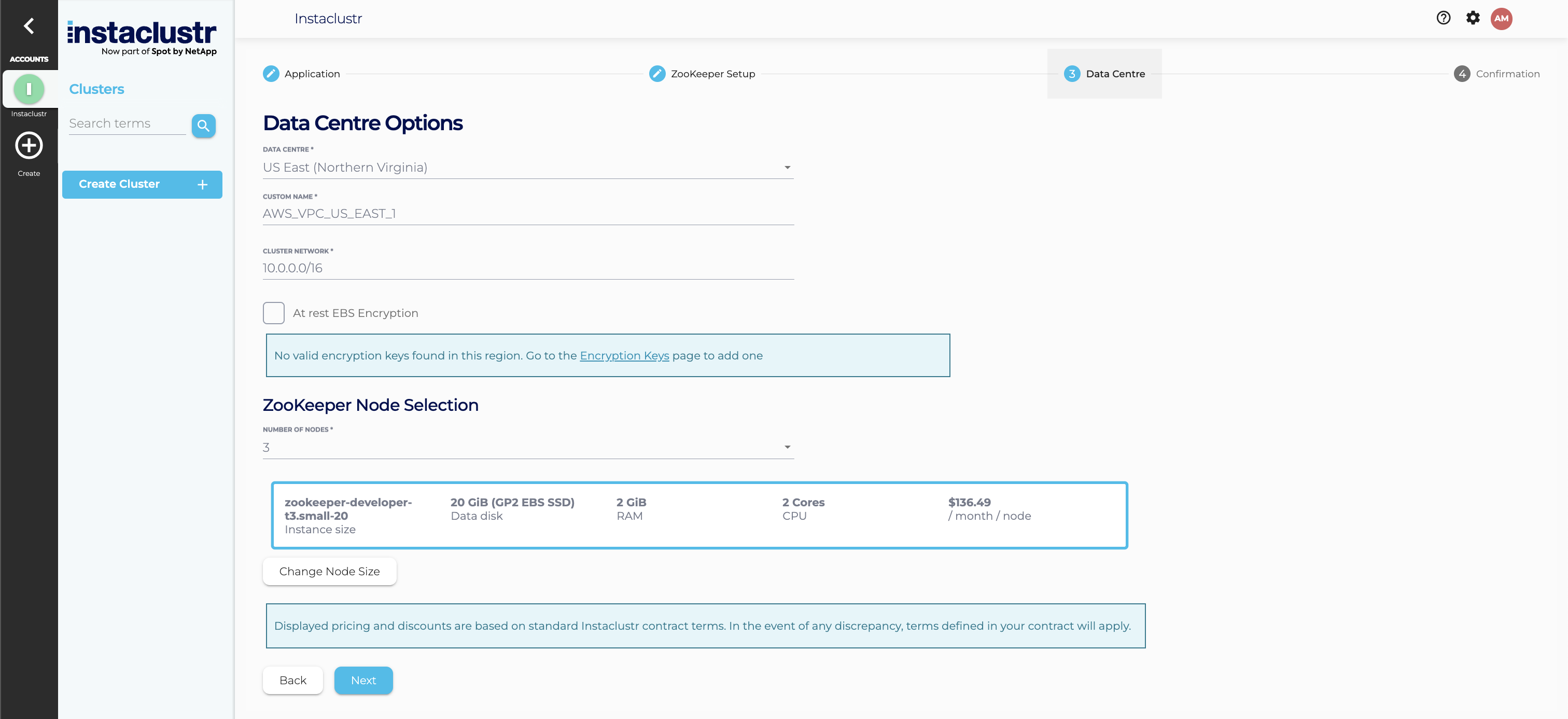 Select a Data Centre Region, a Cluster Network address block, the number of nodes for your application, and your desired node size.