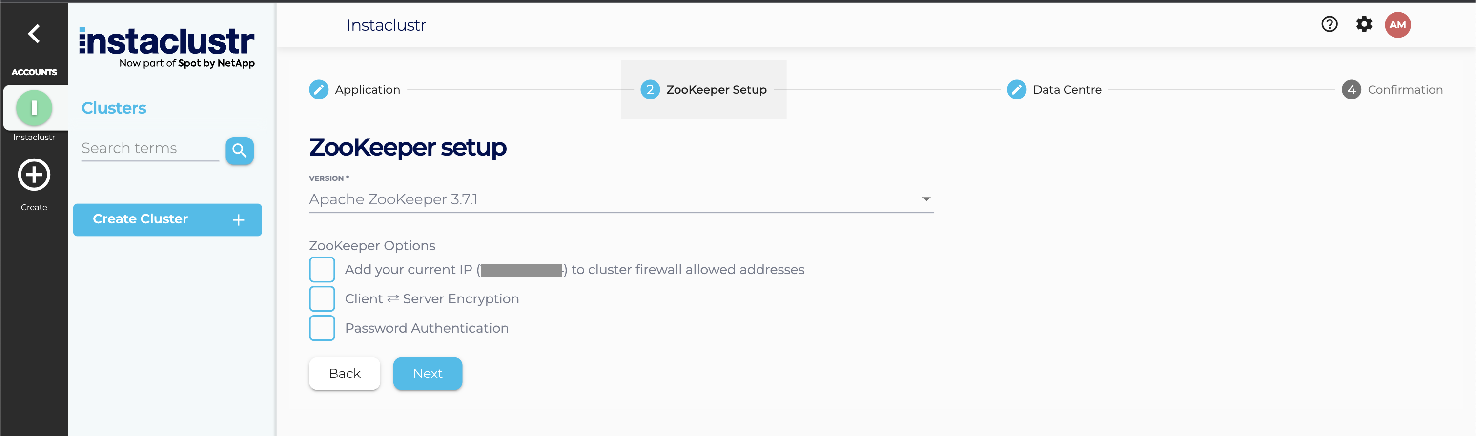 Select a ZooKeeper version, and choose your settings for your firewall rules, Client ⇄ Server Encryption and Password Authentication. Instaclustr detects the IP address of the computer used to access the Console and provides the option to add a firewall rule for your computer to connect to the cluster. Certain web proxies may interfere with this mechanism and Instaclustr will see their IP address instead. We suggest you verify the detected address.