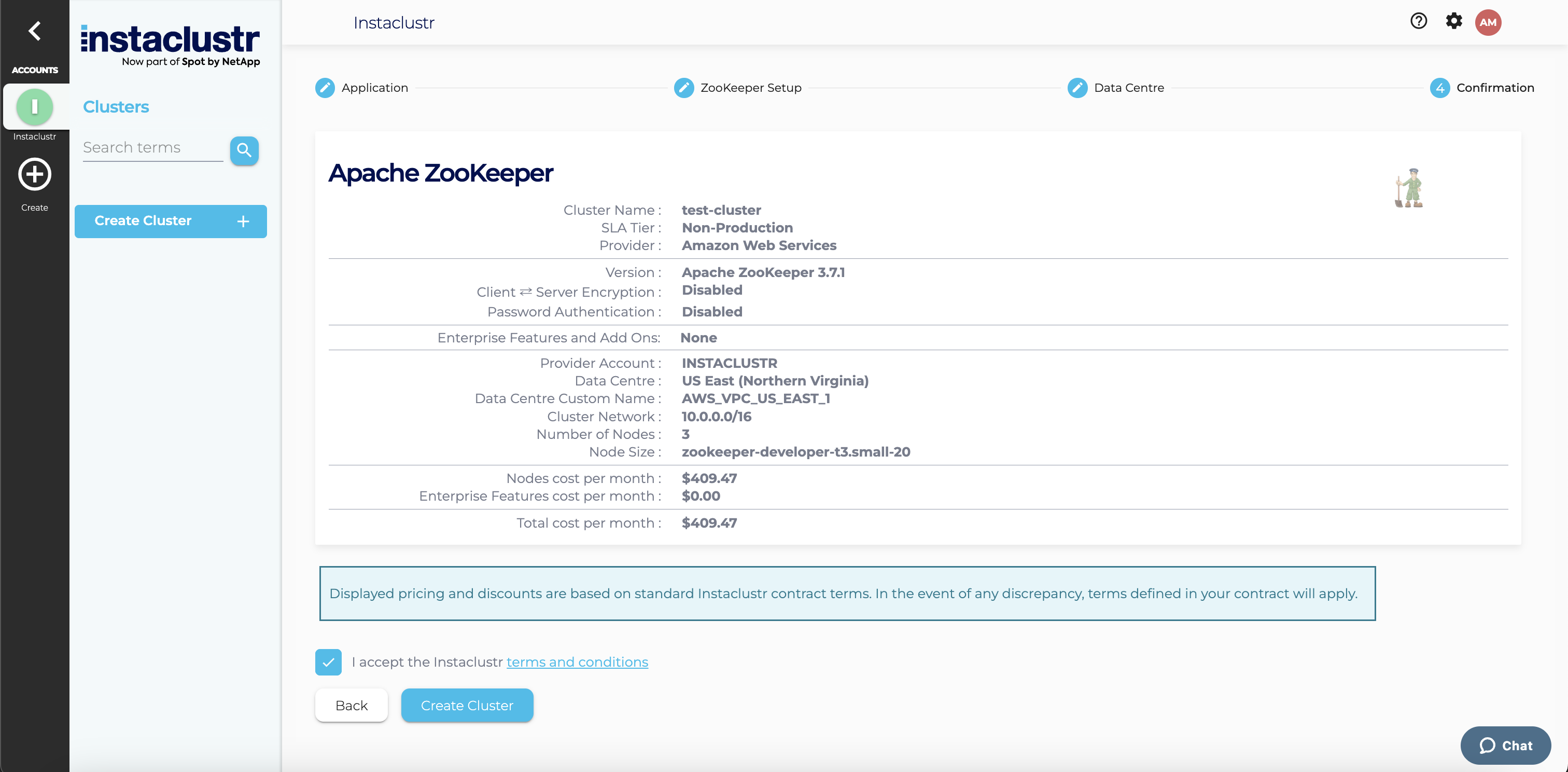 The Confirmation section displays a summary of your cluster configurations and pricing details. Click the Terms and Conditions link to open the Instaclustr Terms and Conditions. After going through the document, select the checkbox to accept the Terms and Conditions. Once you are happy with the cluster configuration and have accepted the terms and conditions, click the Create Cluster button to start provisioning the cluster.