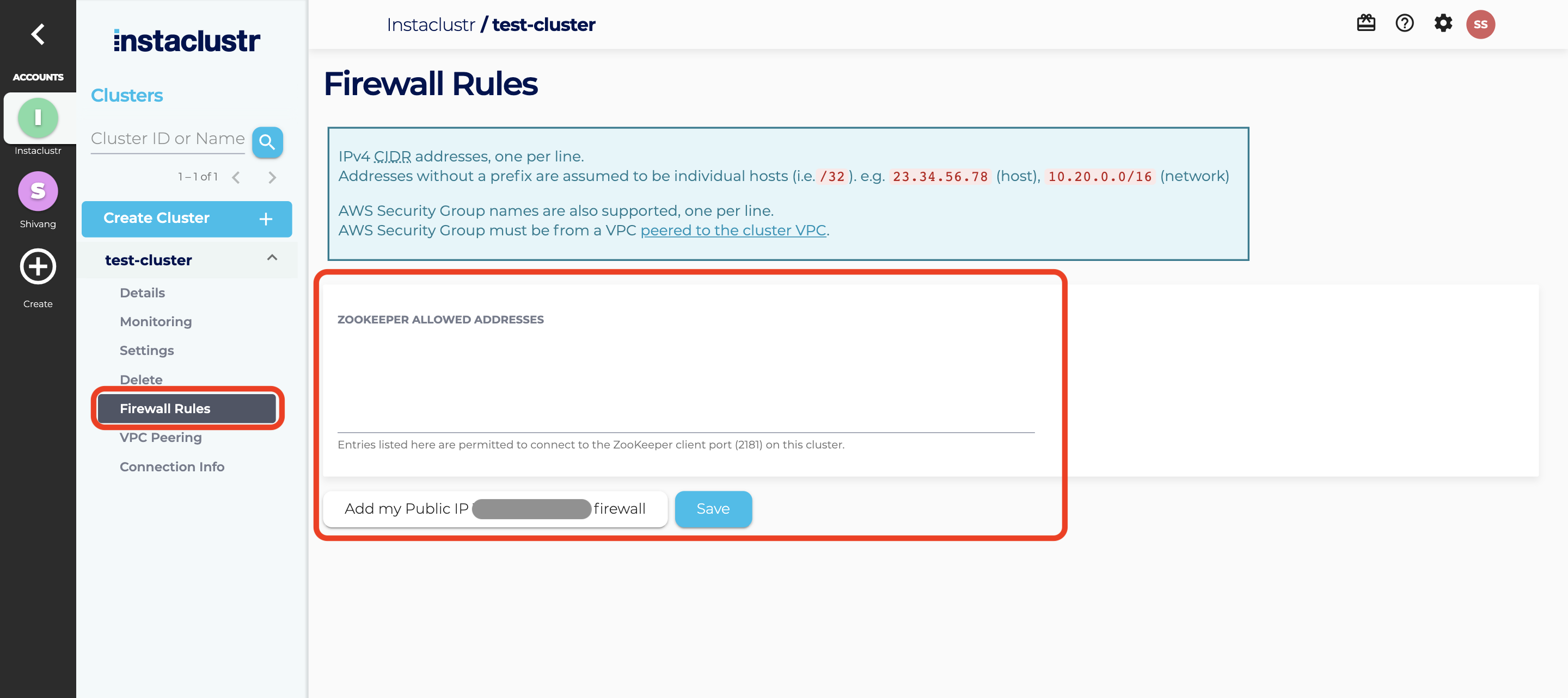 Under Firewall Rules section, enter any additional IP addresses you wish to trust to the ZooKeeper Allowed Addresses list. Click the Save button when you are finished.