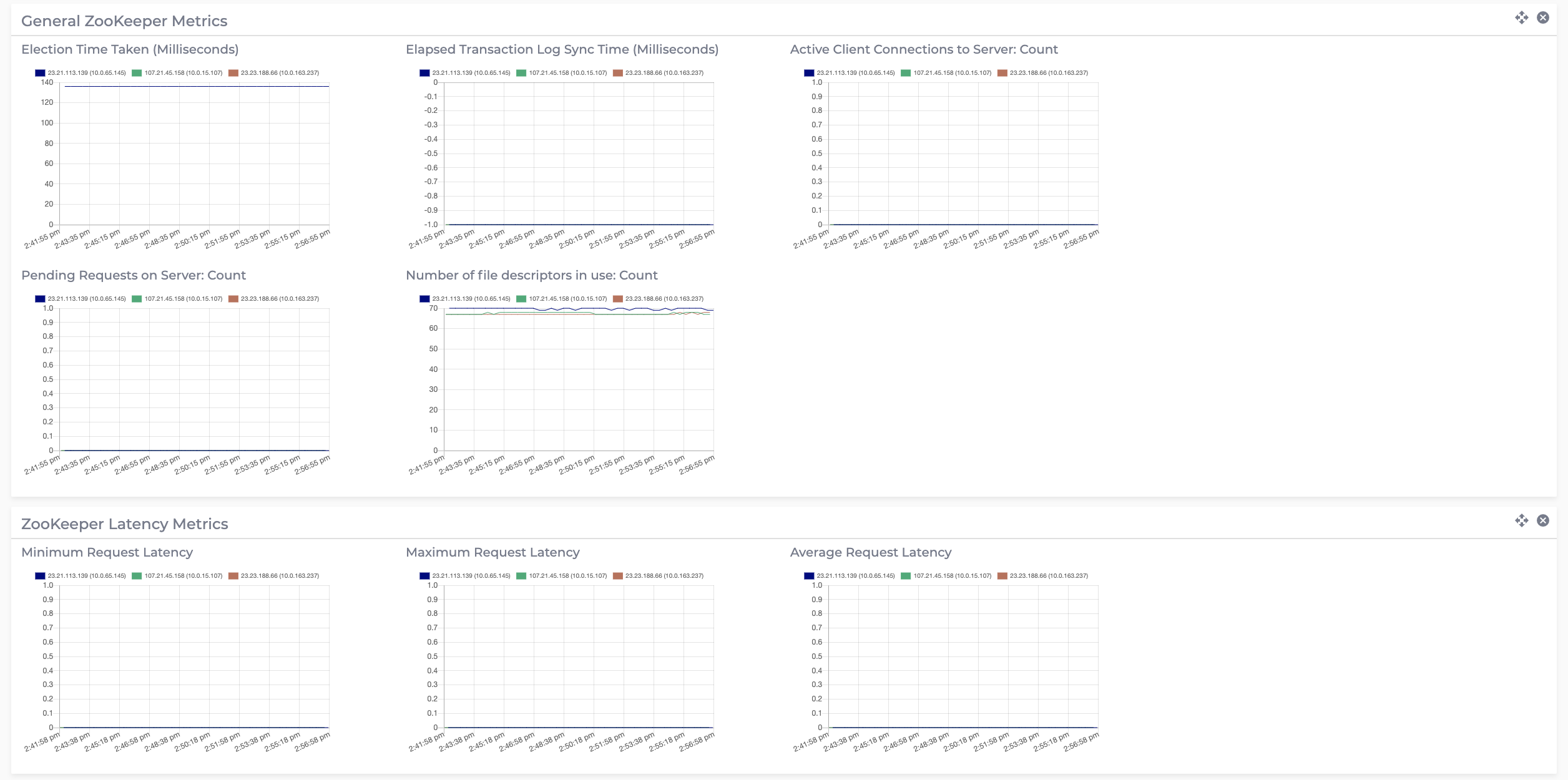 - Initially, the page will display only the Summary monitoring information: CPU Usage, Disk Usage, and Packets Sent and Received by ZooKeeper. However, you can access additional ZooKeeper specific metrics using the search bar at the top of the page. For example, you may add General ZooKeeper Metrics and ZooKeeper Latency Metrics to your monitoring page like so: