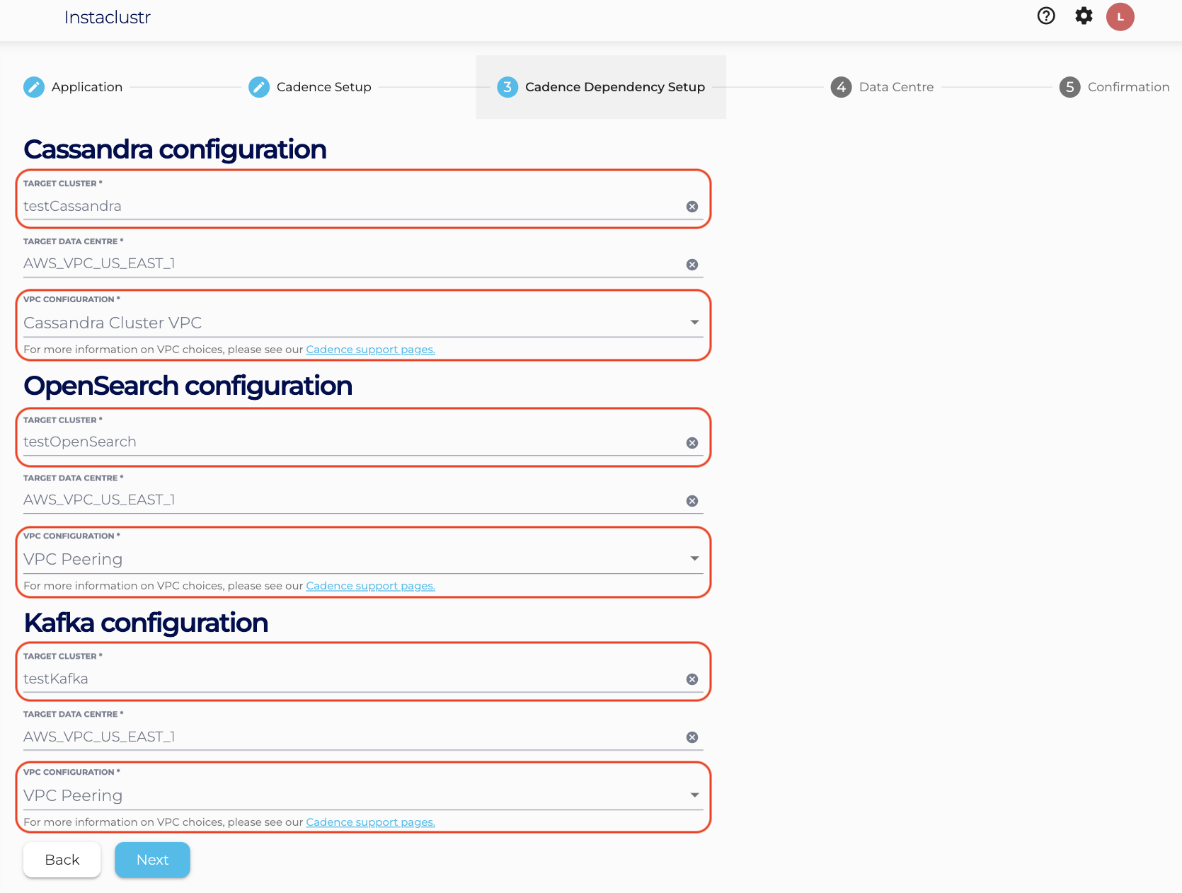 - On the Cadence Dependency Setup page, you will be given the option to specify your supporting clusters for the Cadence cluster, and to configure the connections between the clusters. In each section, select the Cassandra, OpenSearch or Kafka cluster that you wish to use as the supporting cluster. Additionally, you can specify the VPC configuration that you would like to exist between your Cadence cluster and each of the supporting clusters in the VPC Configuration dropdown. Configuring the Cadence VPC gives a detailed explanation about the different approaches to configuring the Cadence VPC.