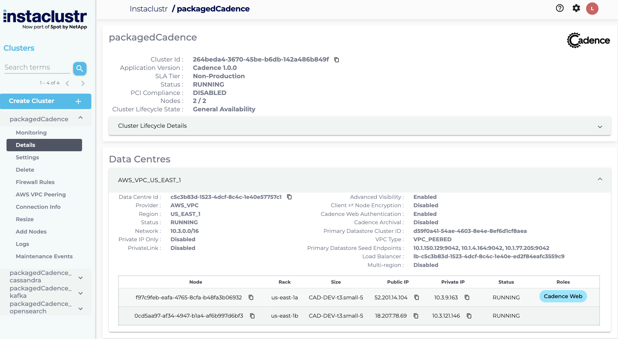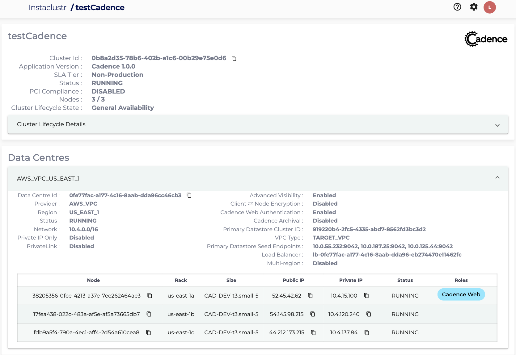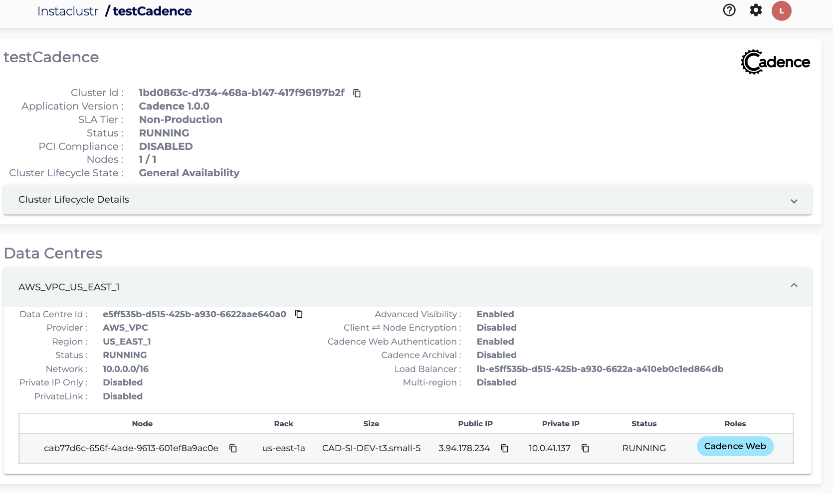 - Instaclustr’s provisioning system will begin to create the Cadence cluster instances. In the Cluster Details page we can monitor the progress of the provisioning steps. Once the cluster reaches a Running state, you have finished creating your Advanced Visibility Cadence cluster!