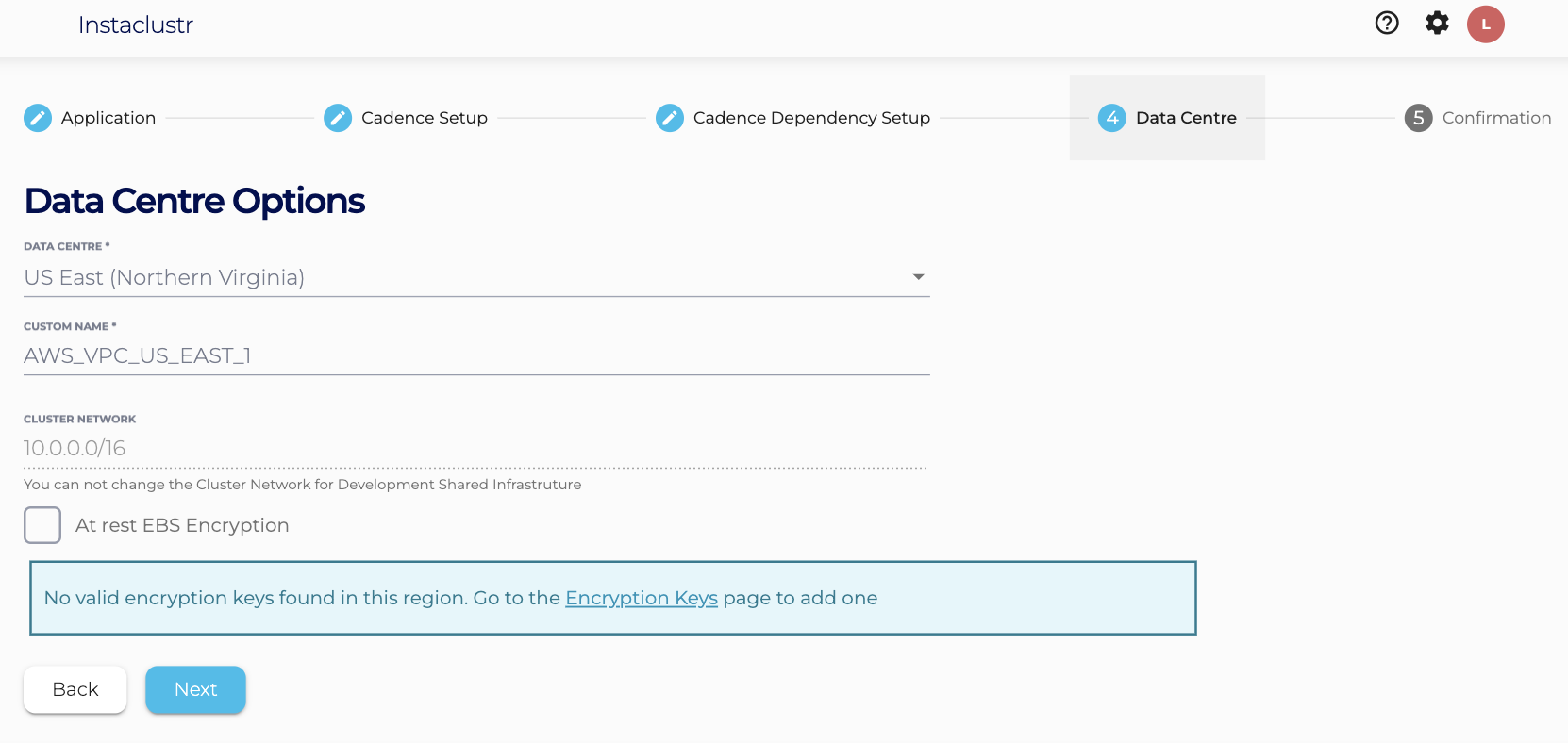 - Under the Data Centre section, only US East (Northern Virginia) – US_EAST_1 is available when running under the Instaclustr account. If selecting to run in your own account, then any region available in your account can be used, but it is highly recommended to use US_EAST_1 to minimise latency and improve performance. Click Next.