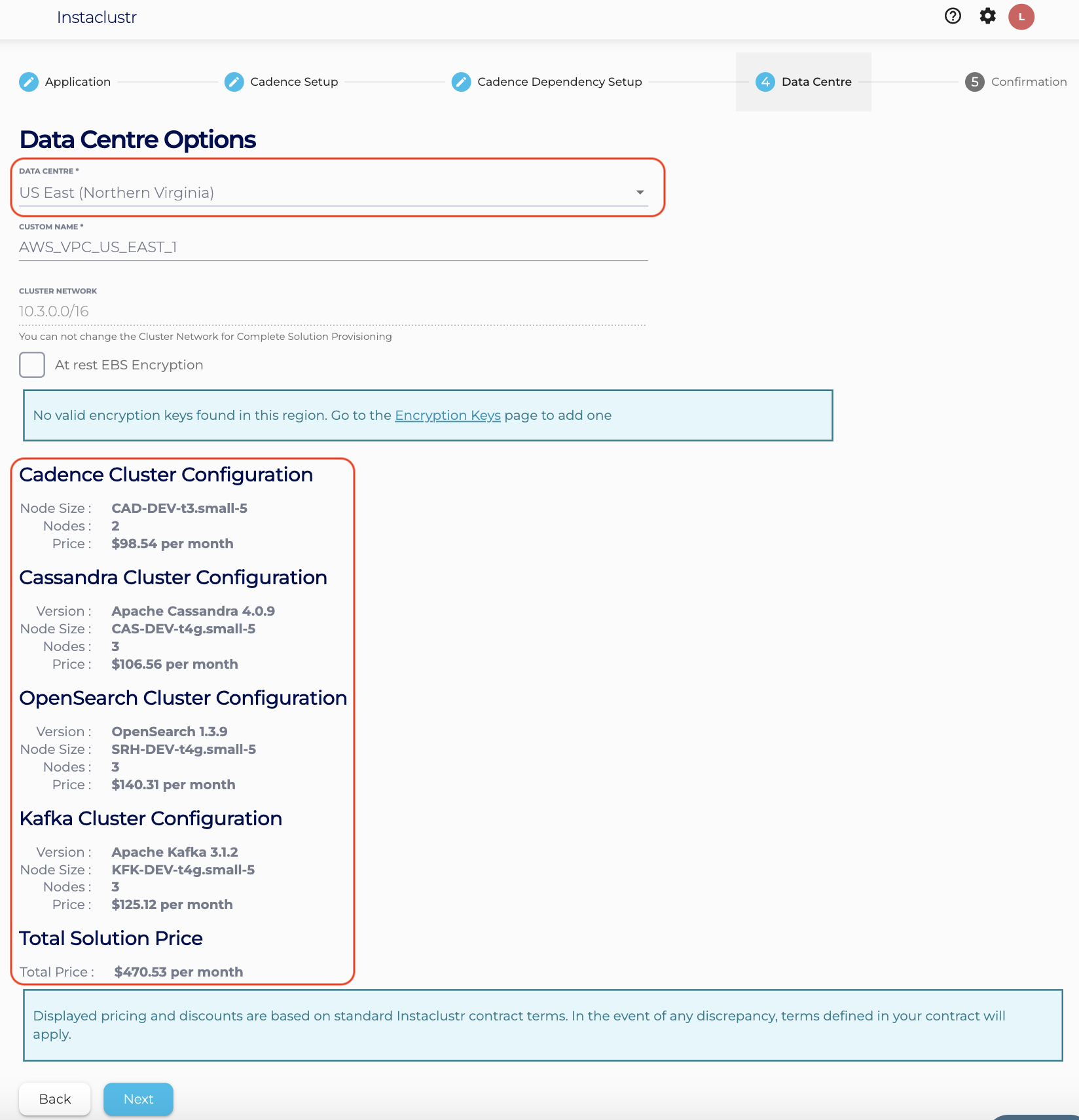 - Under the Data Centre section, select a Data Centre Region and click Next. The page will also summarise the Cadence and the Cassandra, Kafka and OpenSearch cluster configurations.