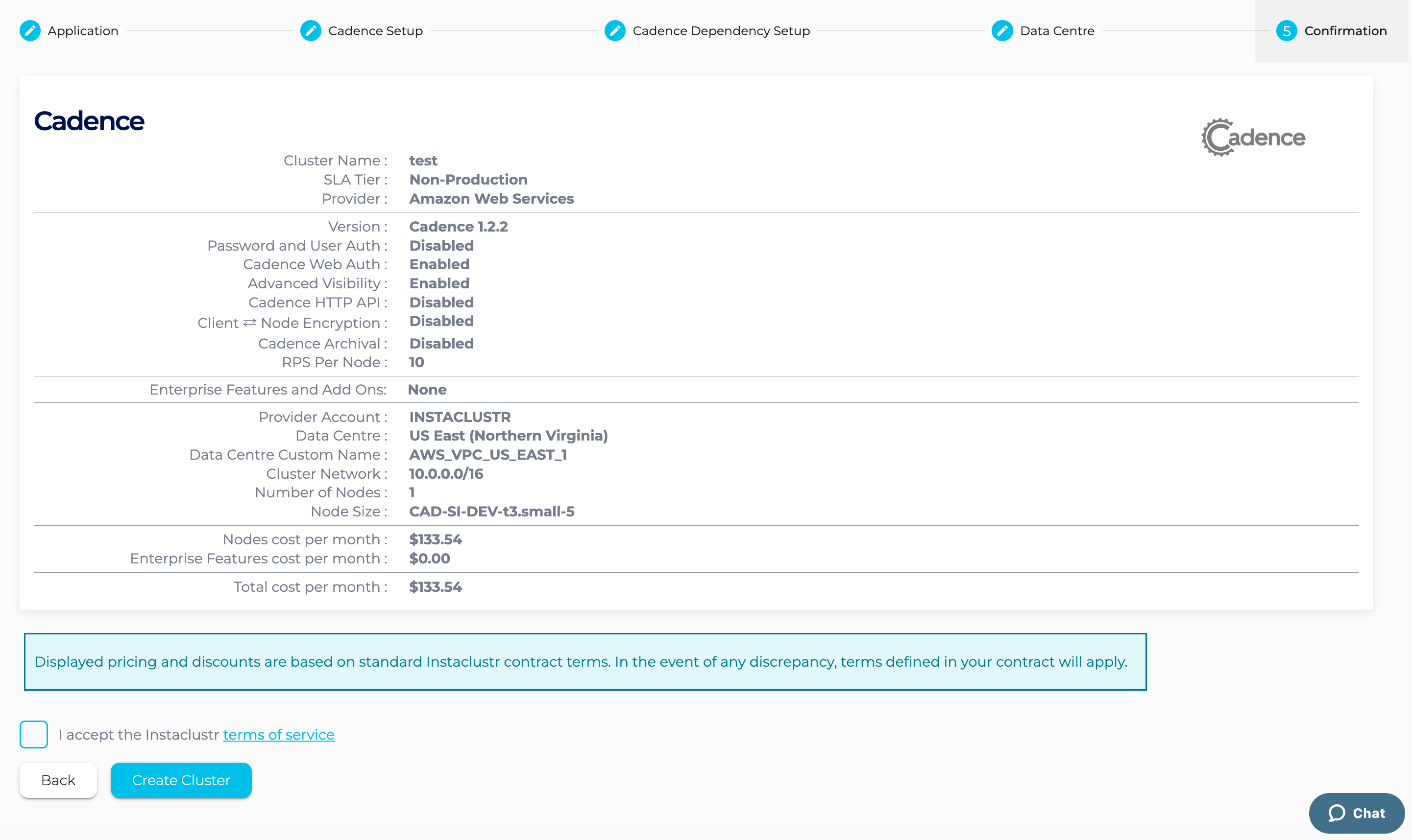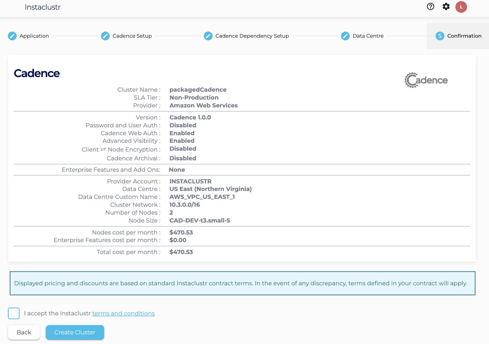 - The Confirmation section displays a detailed summary of your cluster configurations and pricing details. If you are happy with the cluster configuration and have accepted the terms and conditions, click the Create Cluster button to start provisioning the Shared Infrastructure Cadence cluster.