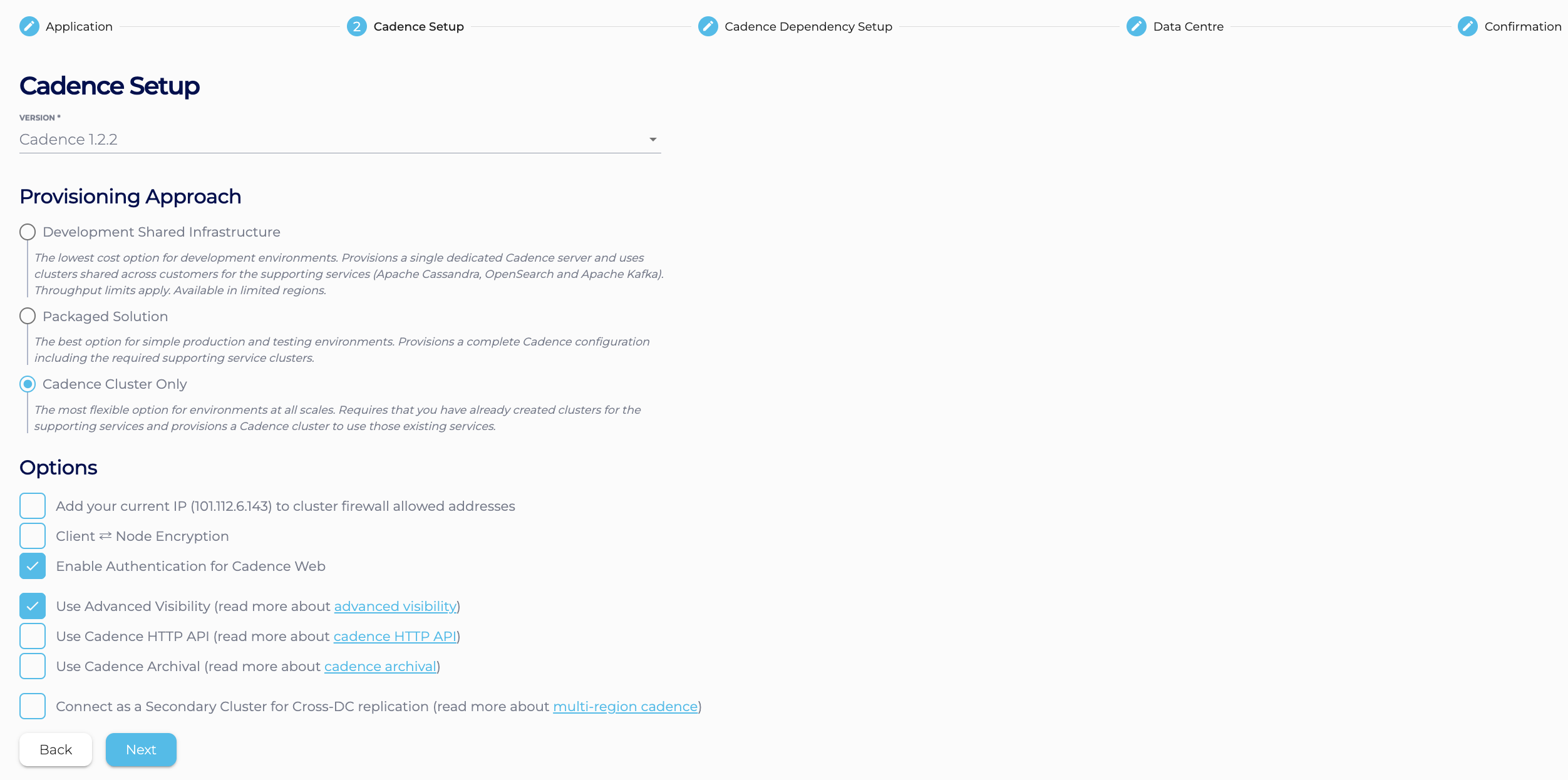 - On the Cadence Setup page, we can select the version of Cadence. We are currently only offering Cadence 1.2.2. Select “Cadence Cluster Only“ as the provisioning approach. Also check the “Use Advanced Visibility“ option.