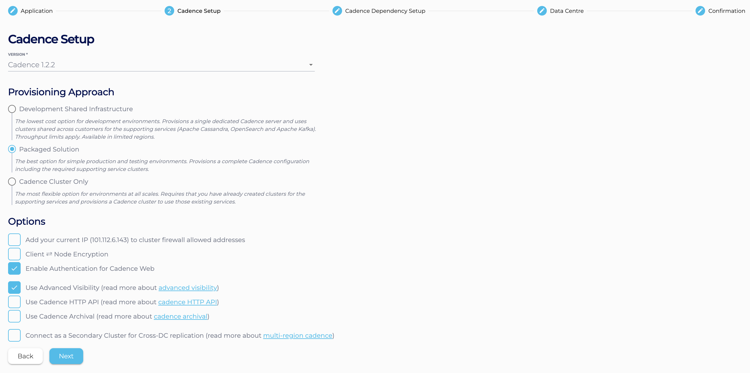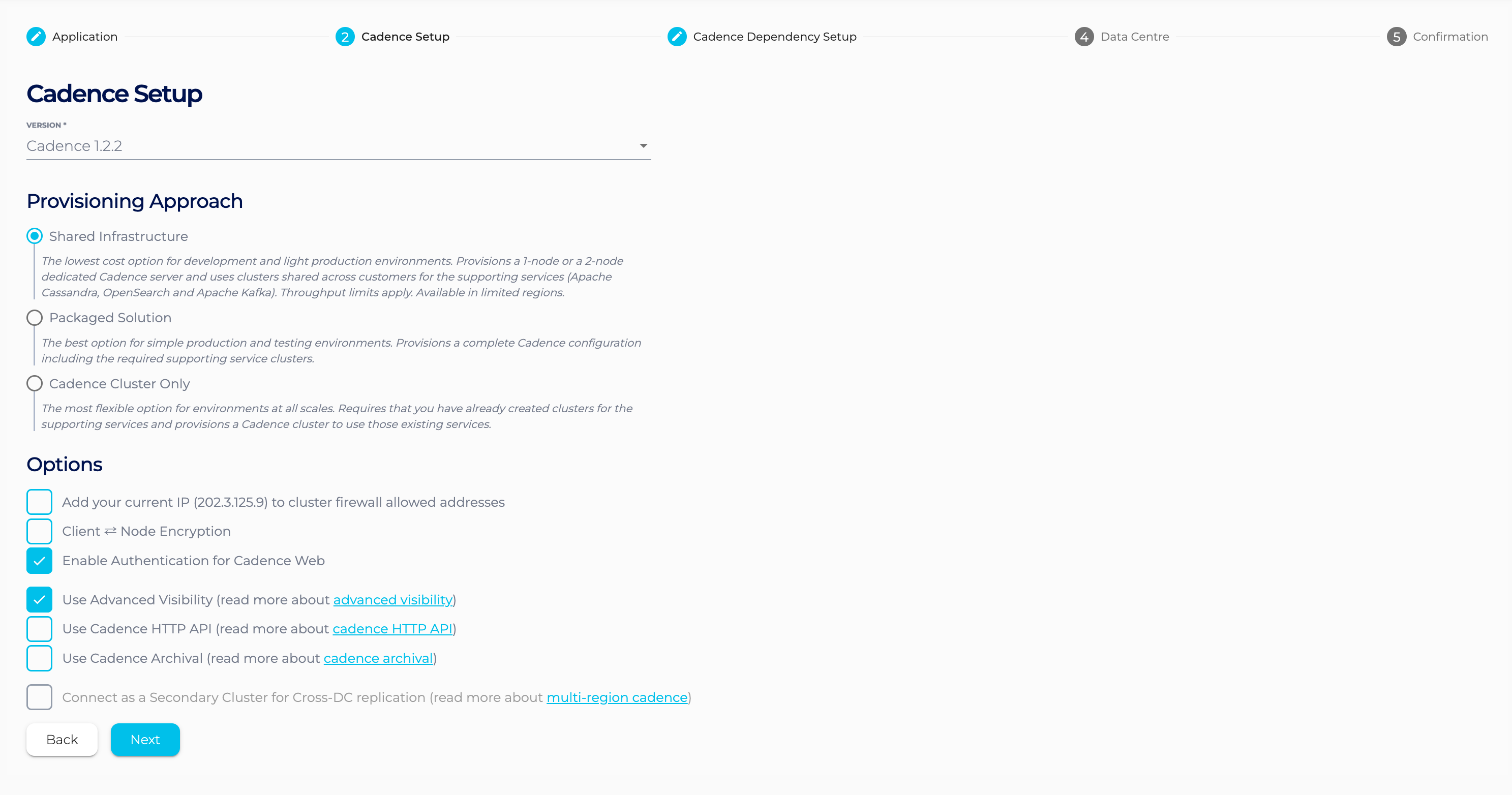 - On the Cadence Setup page, we can select the version of Cadence. We are currently offering Cadence 1.2.2. Select “Shared Infrastructure“ as the provisioning approach. Also check the “Use Advanced Visibility“ option.