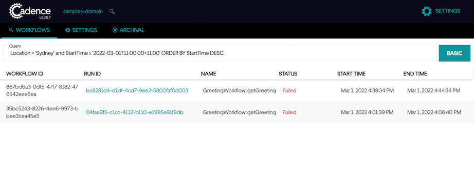 import com.uber.cadence.serviceclient.ClientOptions; import com.uber.cadence.serviceclient.WorkflowServiceTChannel; import com.uber.cadence.ListWorkflowExecutionsRequest; import com.uber.cadence.ListWorkflowExecutionsResponse; final String DOMAIN = "samples-domain"; final WorkflowServiceTChannel cadenceService = new WorkflowServiceTChannel( ClientOptions.newBuilder() .setHost("127.0.0.1") .setPort(7933) .build()); ListWorkflowExecutionsRequest request = new ListWorkflowExecutionsRequest(); request.setDomain(DOMAIN); request.setQuery("Location = ‘Sydney’" + " AND StartTime > ‘2022-03-01T11:00:00+11:00" + " ORDER BY StartTime DESC"); try { ListWorkflowExecutionsResponse resp = cadenceService.ListWorkflowExecutions(request); } catch (Exception e) { // ... } |