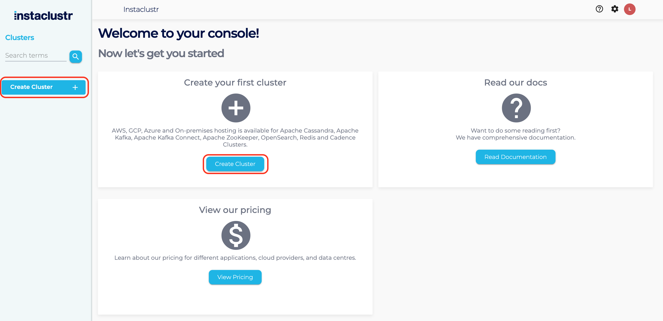 - Log into the Instaclustr Console and click the Create Cluster button. This will take you to the wizard for creating a new cluster.