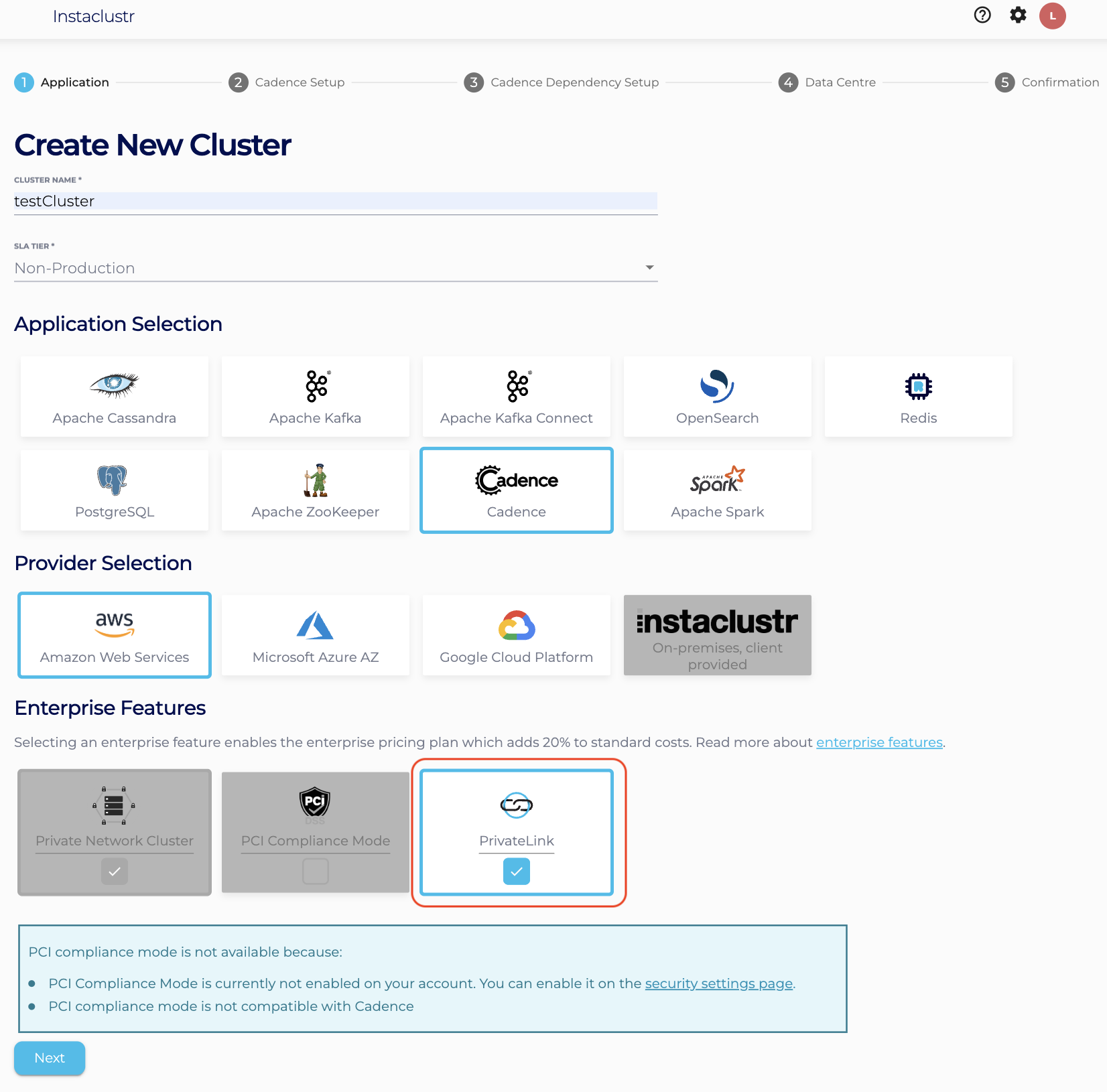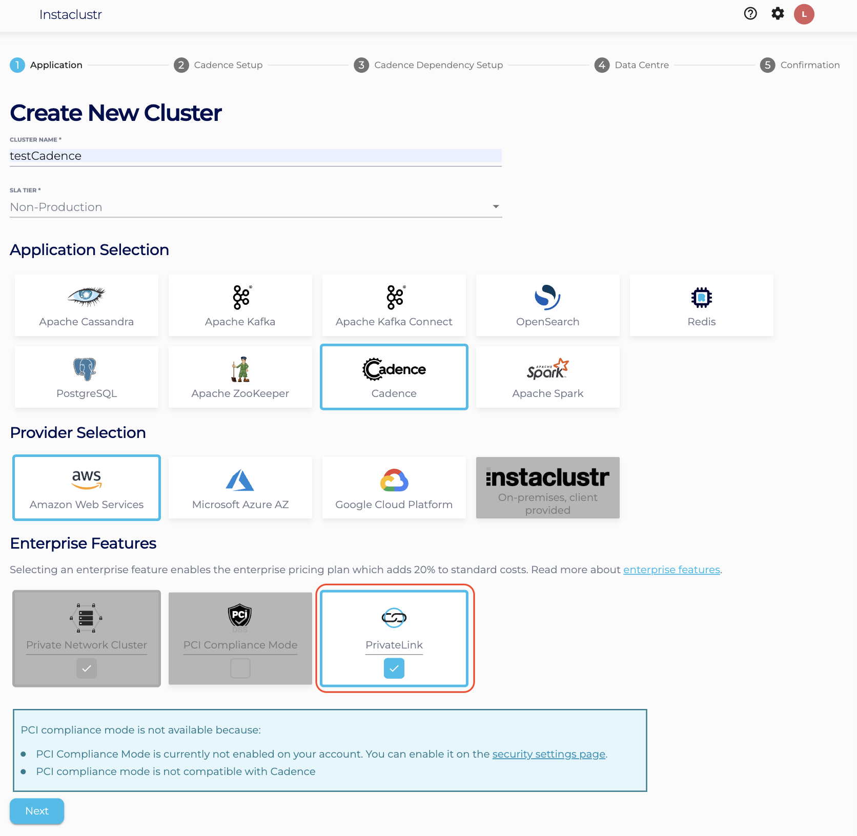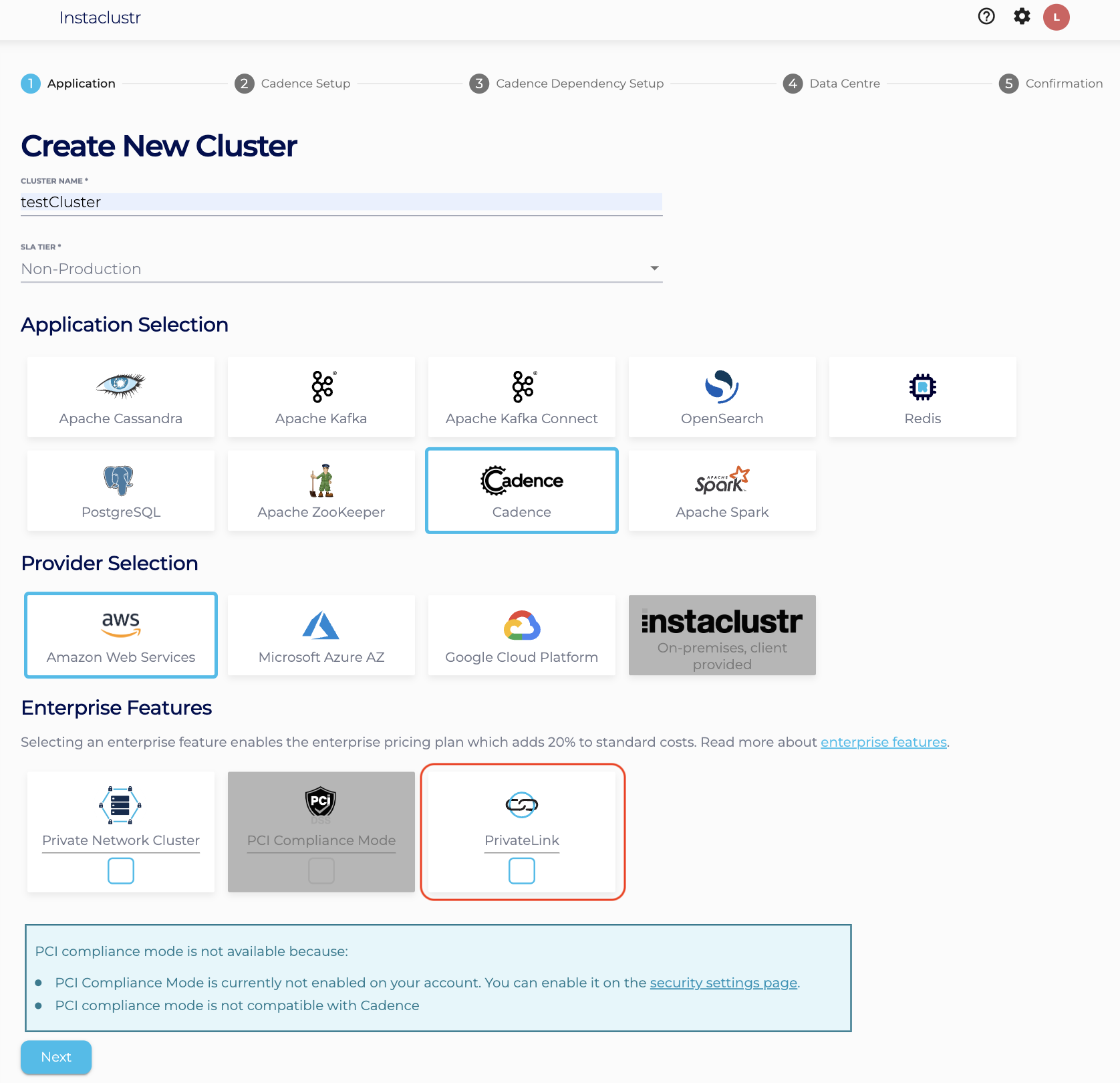 - Give your cluster a name, select Cadence as the application, and select AWS as the provider. You should see a checkbox under Enterprise Feature called PrivateLink.