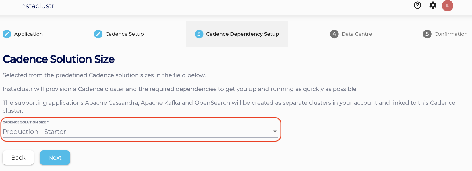 - On the Cadence Dependency Setup page, select one option from the predefined Cadence Solution Sizes (Production – Starter or Production – Small) and click Next. This will provision a Cadence cluster and the required Cassandra cluster of the selected (predefined) size in your account and link them together.