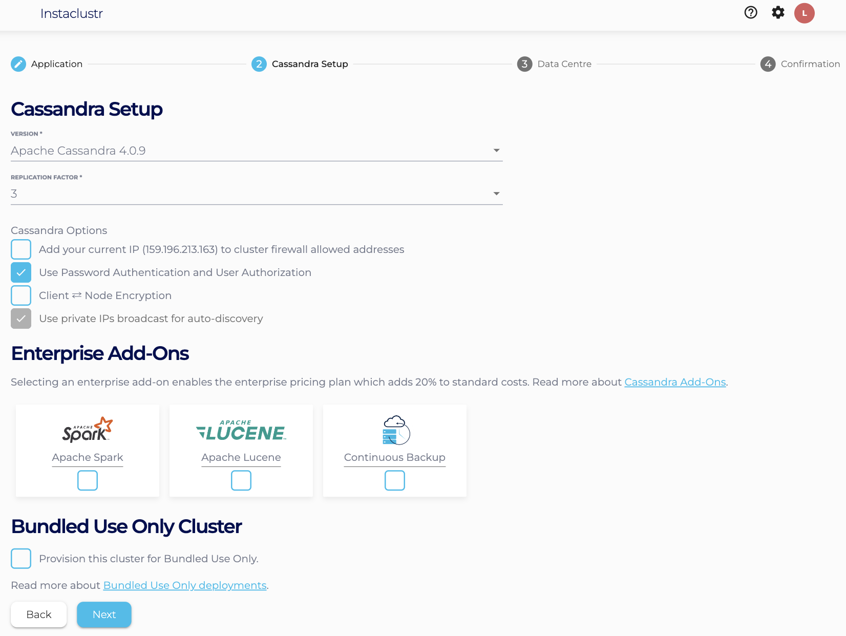 - Give your cluster a name, select Apache Cassandra as the application, select AWS as the provider, select Private Network Cluster, and click Next.