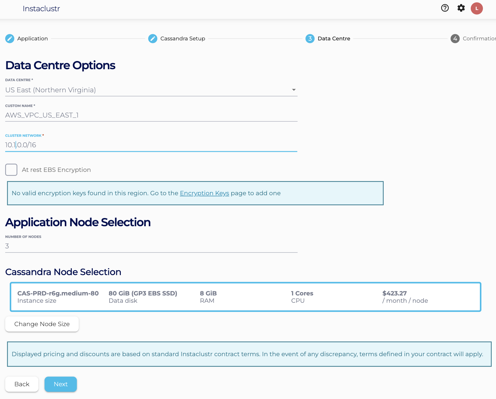 - A cluster network address block (Note: Provide a non-overlapping CIDR block for VPC Peering and Cassandra Cluster VPC option),