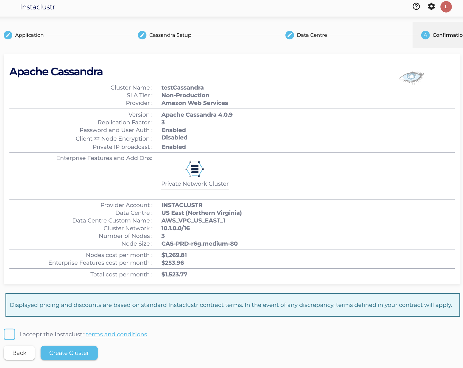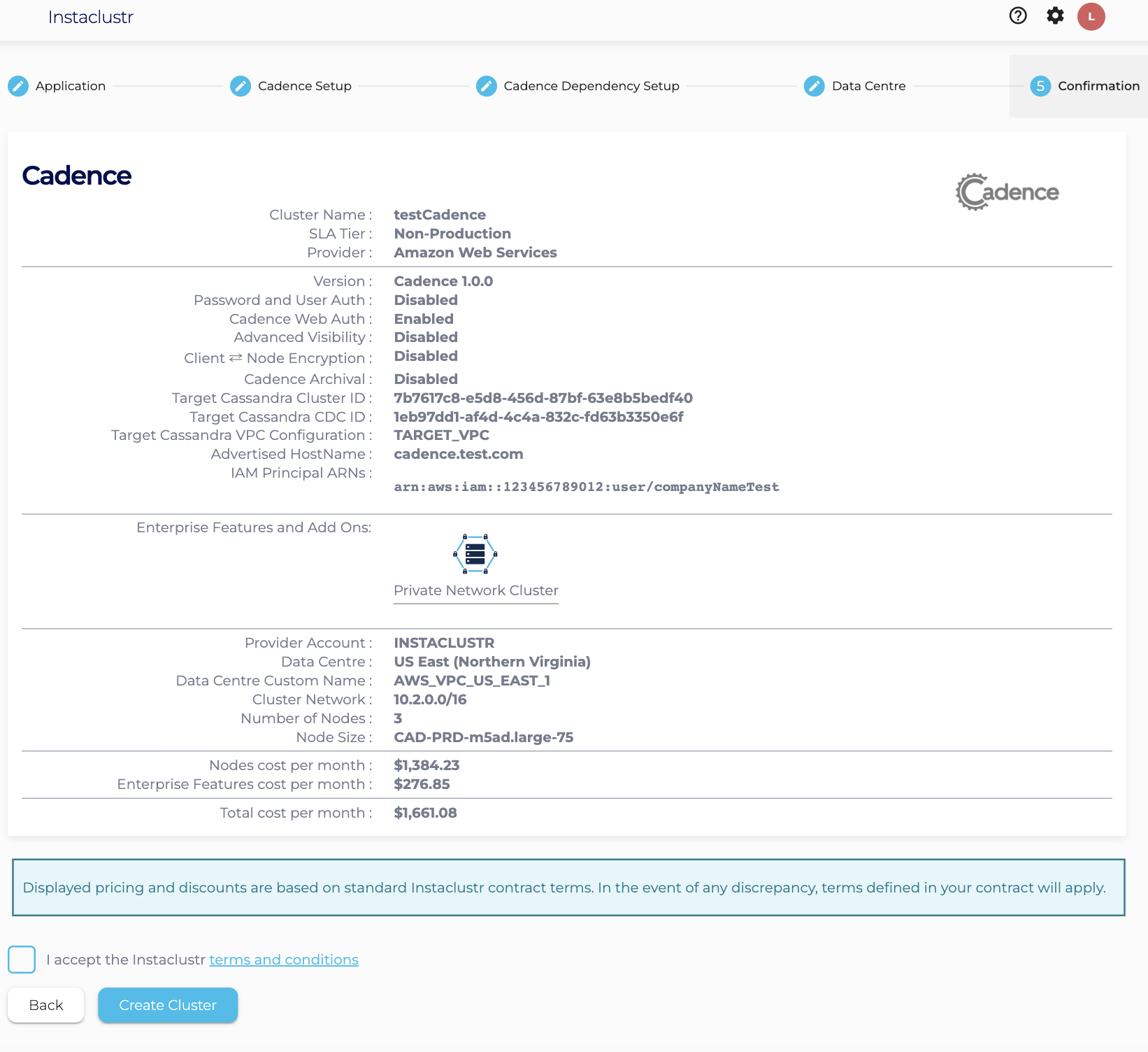 - Under the Confirmation page, check that the configurations such as Advertised HostName and IAM Principal ARNs are properly configured, accept Instaclustr terms and conditions, and click Create Cluster.