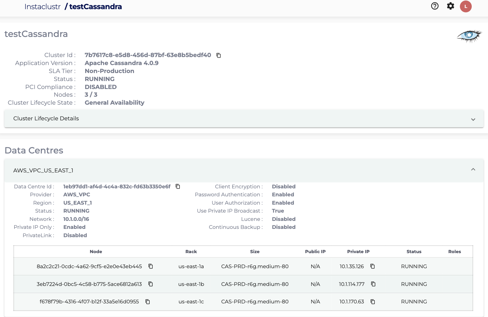 - You have now finished creating your Cassandra cluster, congratulations! All your clusters will be listed on the left sidebar of the console. You can view your cluster’s configuration details by navigating to the Details page.