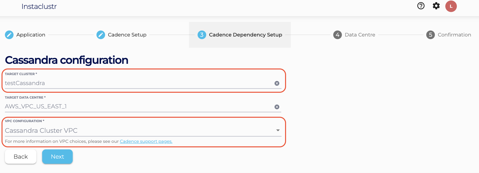 In addition to selecting which Cassandra cluster to link to, we can select how they are linked and communicate over the network, i.e. the Cadence VPC configuration. Configuring the Cadence VPC gives a detailed explanation about the different approaches to configuring the Cadence VPC. - Under the Data Centre section,
