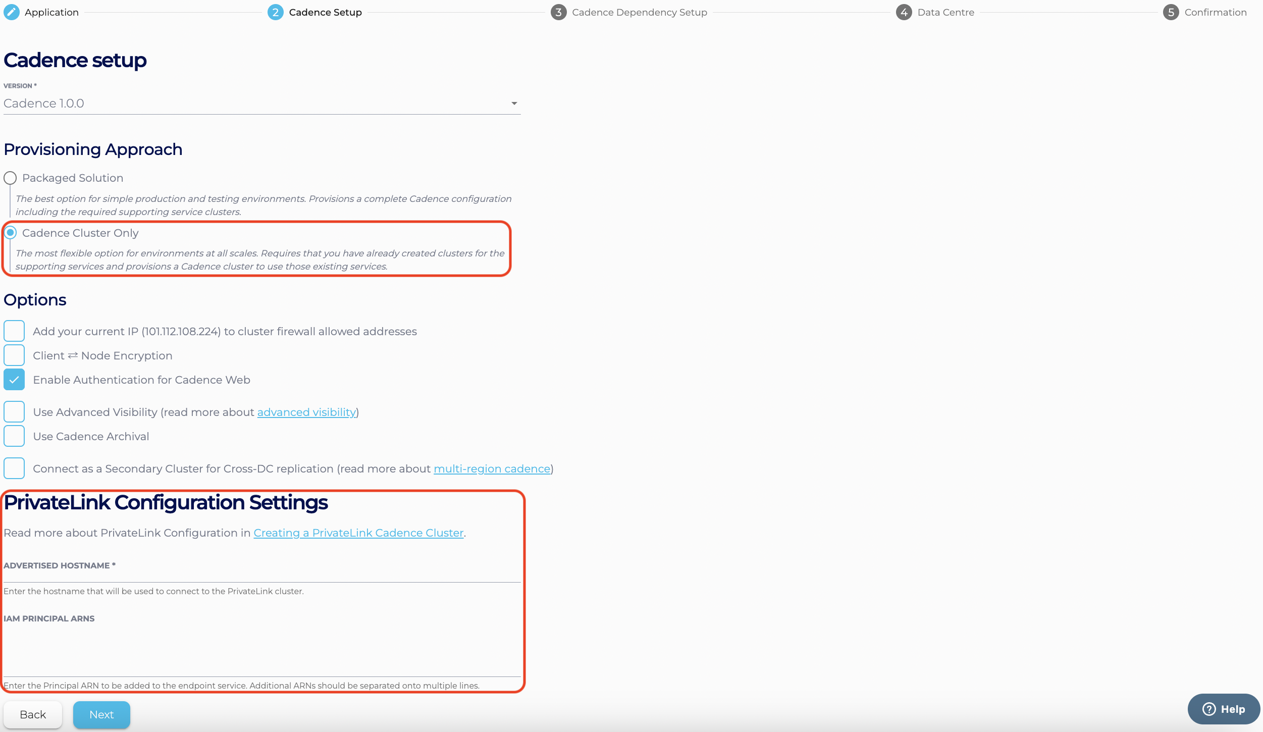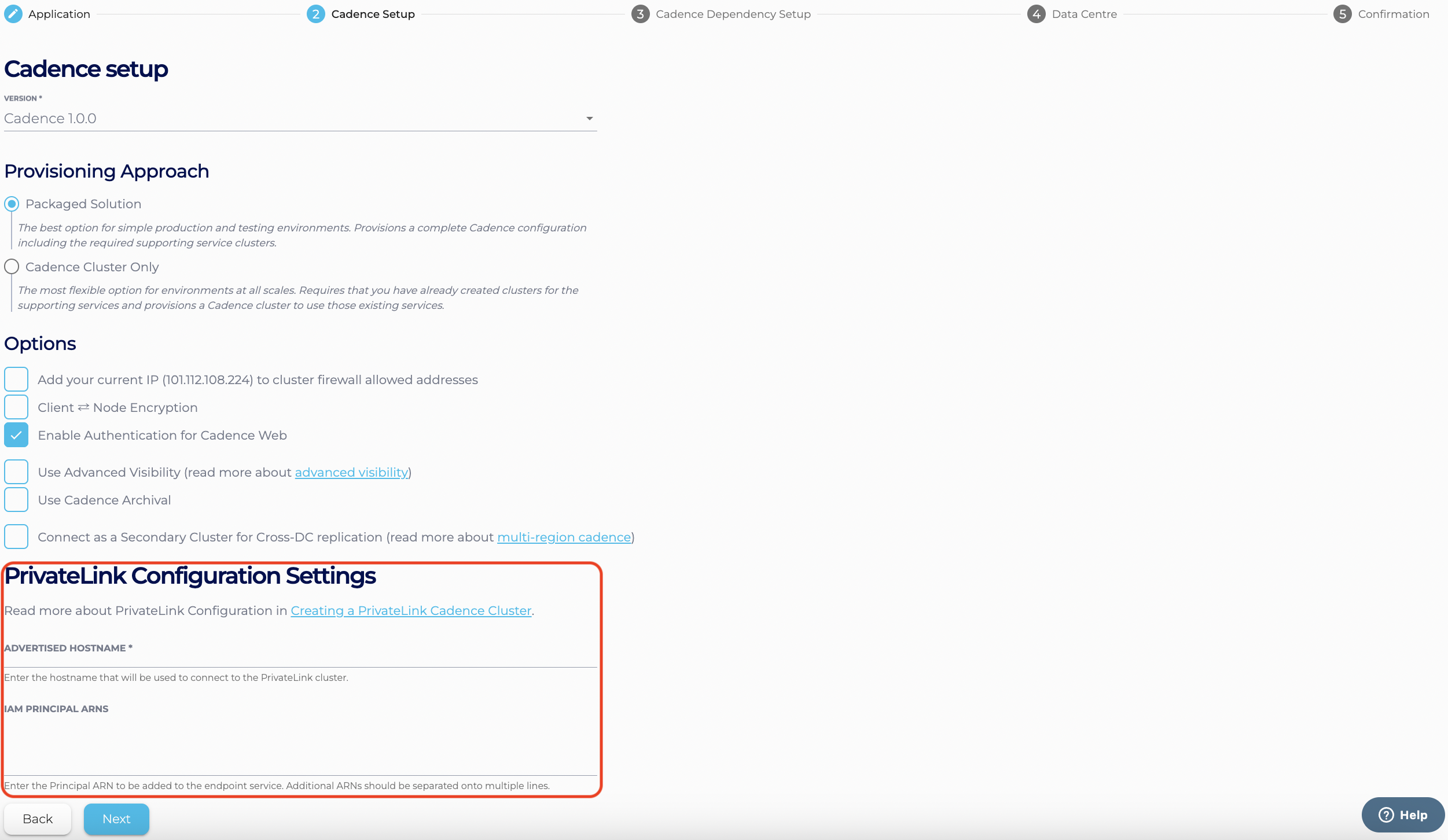 - On the Cadence Setup page, we can select the version of Cadence. Select “Packaged Solution“ as the provisioning approach. There should be a section called PrivateLink Configuration Settings. In this section, there are 2 fields: Advertised HostName is required to be filled and IAM Principal ARNs is optional