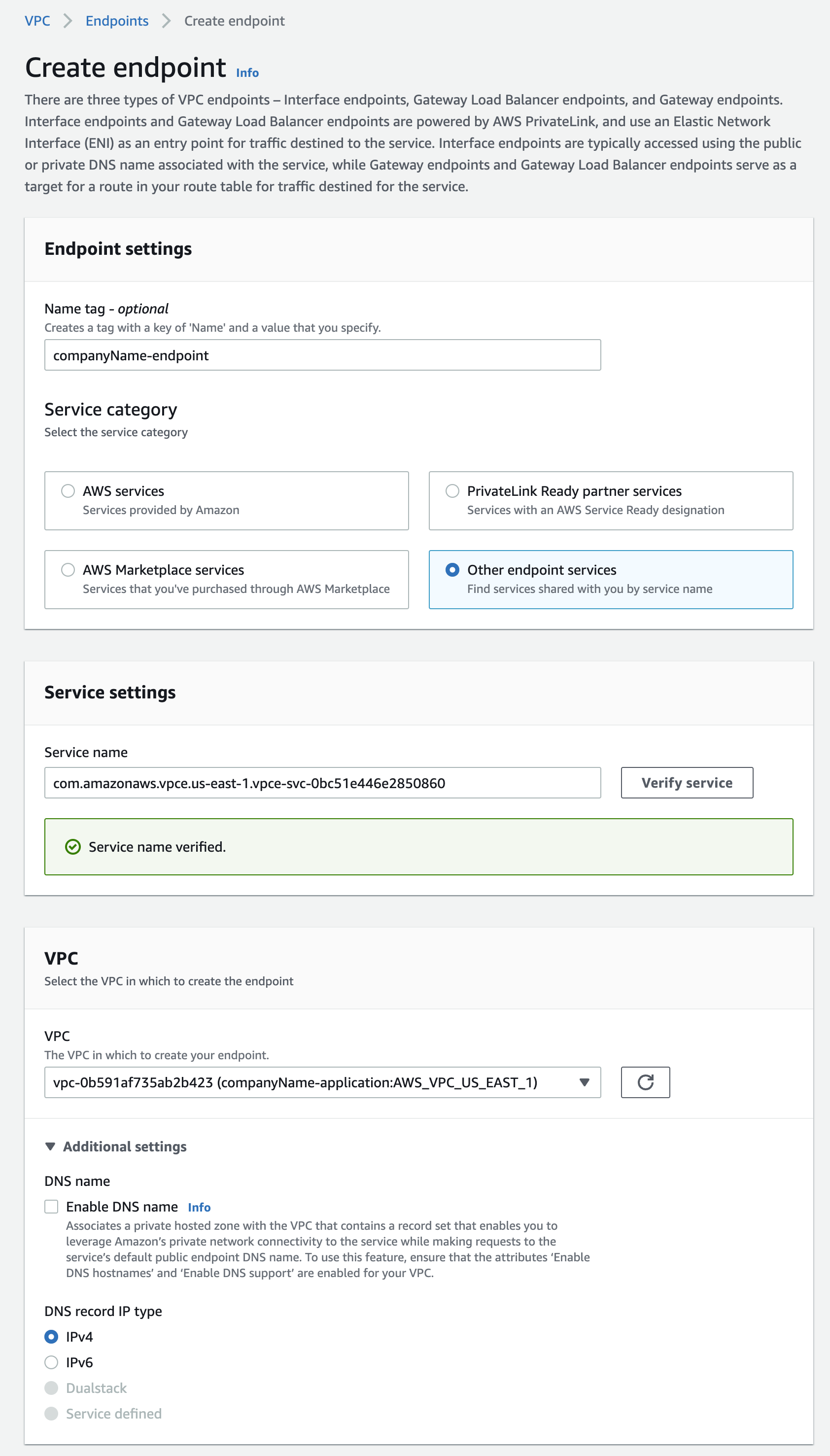- In “Service Settings”, paste the endpoint service name from step 2 to the “Service name” field. Click “Verify service” and a green box will appear.