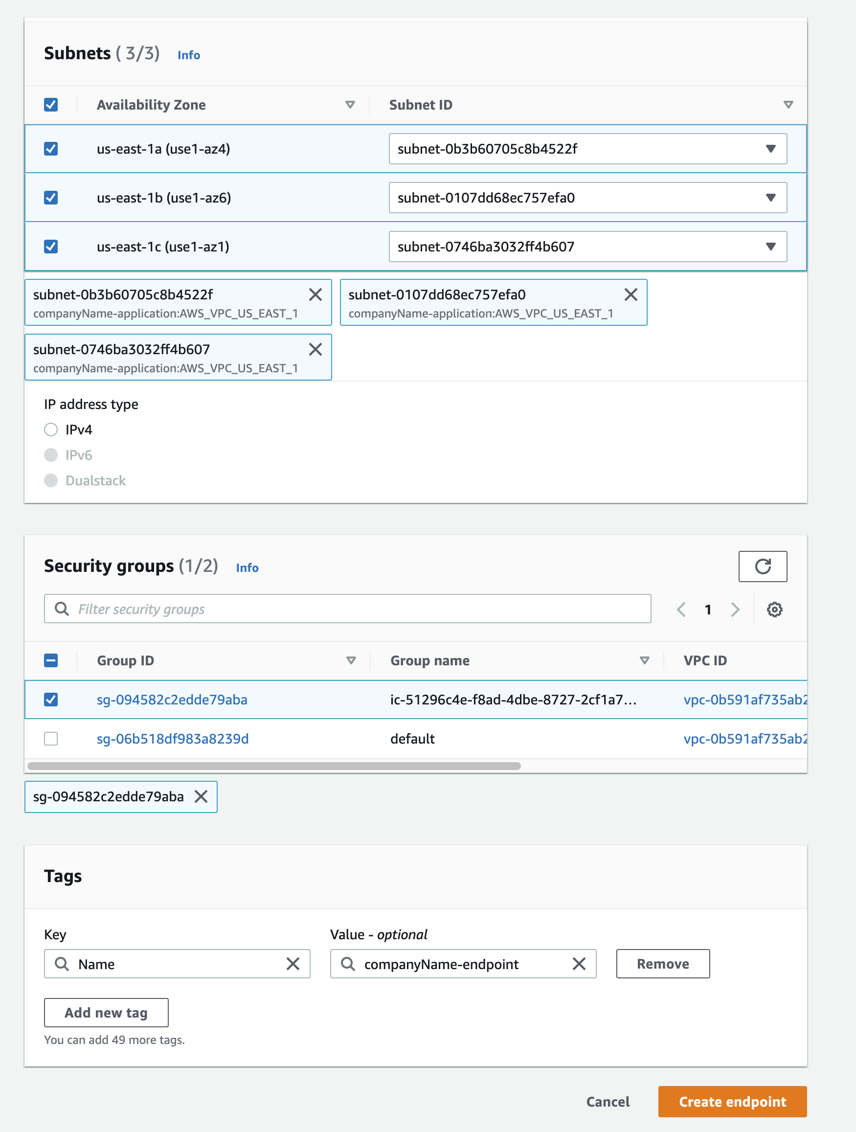 - Select the security group that you created earlier. You will get the following configurations. Once done, click “Create endpoint”.