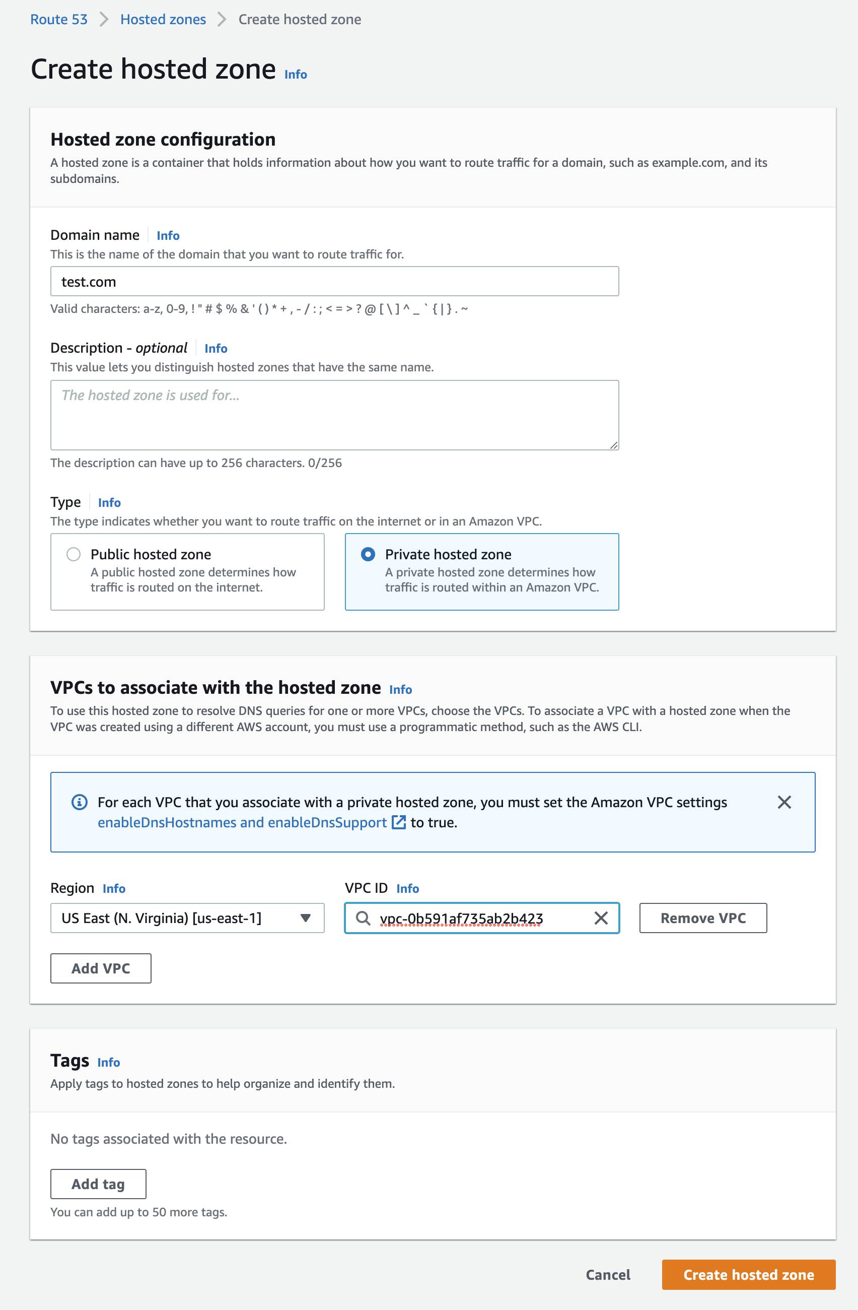 - Ensure you have the following configurations, click “Create hosted zone”.