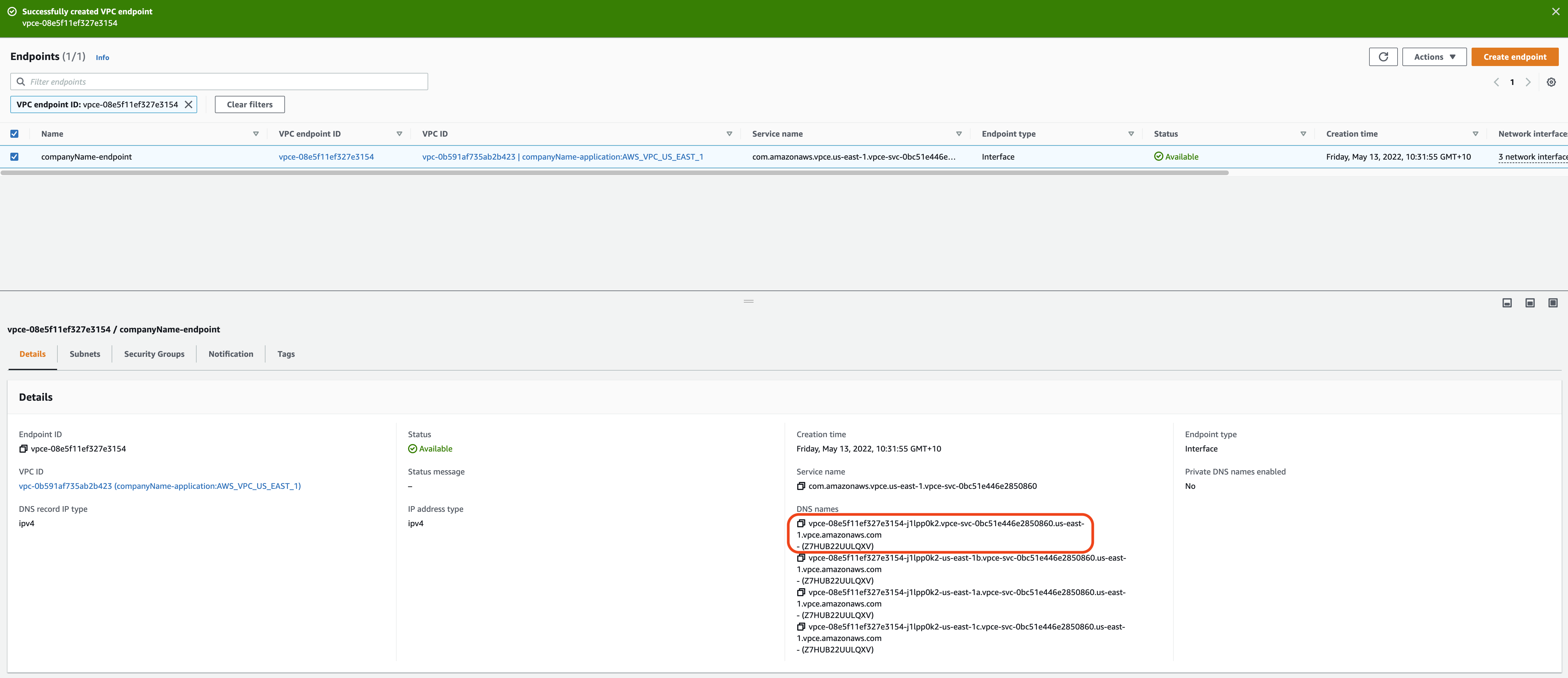- You will be redirected to the main VPC endpoint page which will specifically show the created endpoint. Once the Status of the endpoint reaches Available, copy the first DNS under the “DNS names”.