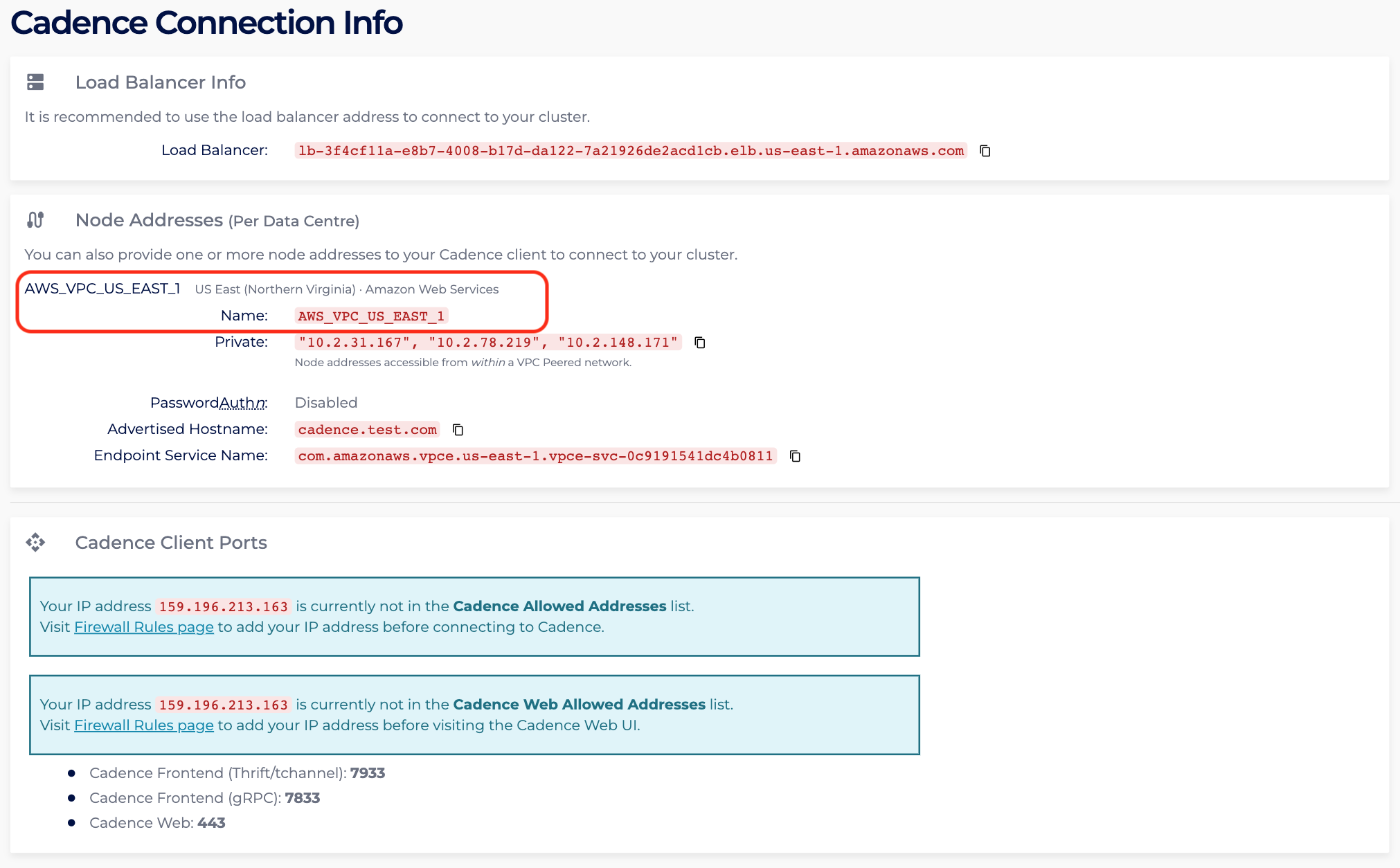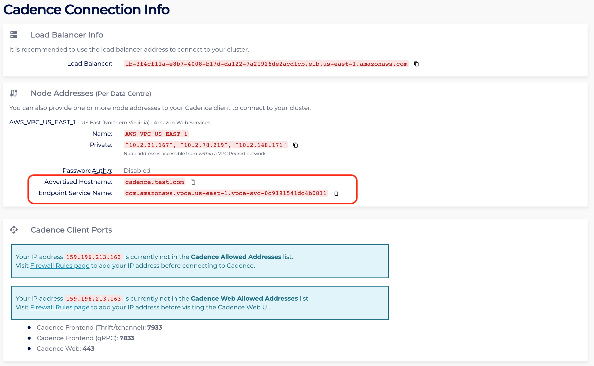 - In the Connection Info page, identify the region of the created PrivateLink Cadence cluster. For instance, the page shows the region is US_EAST_1, hence access to the AWS VPC Endpoint console in the US_EAST_1 region: https://us-east-1.console.aws.amazon.com/vpc/home?region=us-east-1#Endpoints: