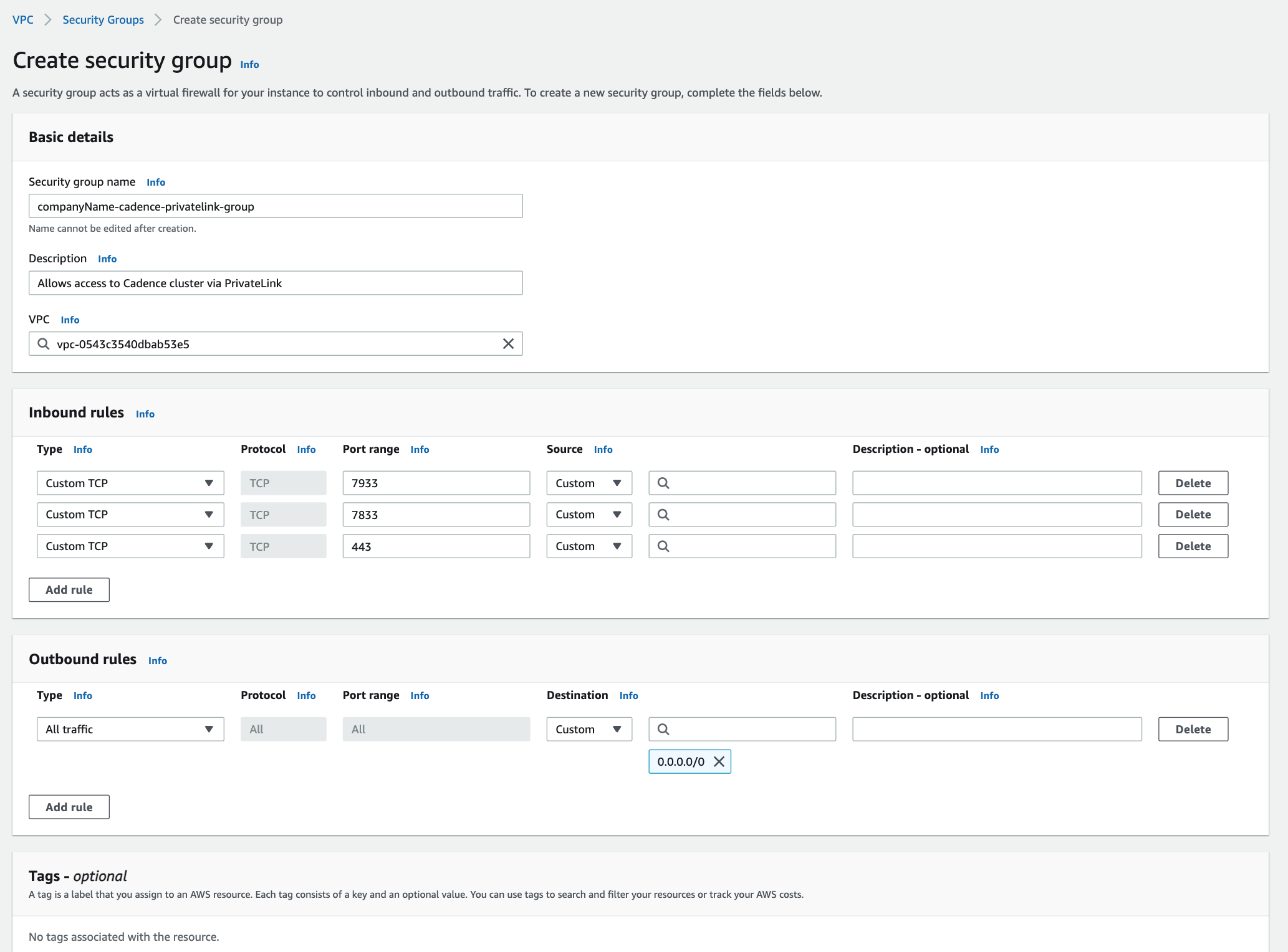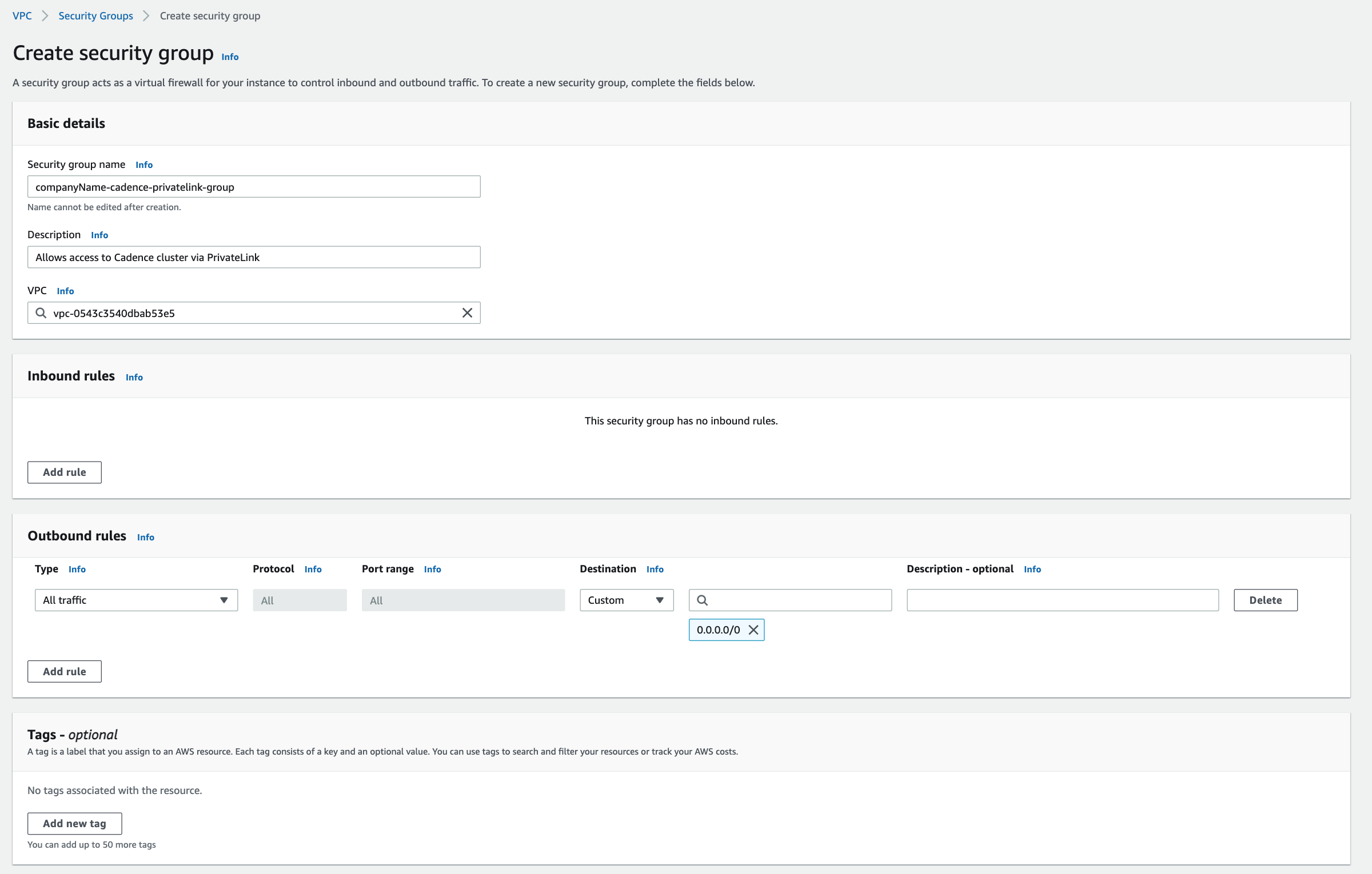 - Under the heading “Description”, enter a short description of the security group. For example, “Allows access to Cadence cluster via PrivateLink”.
