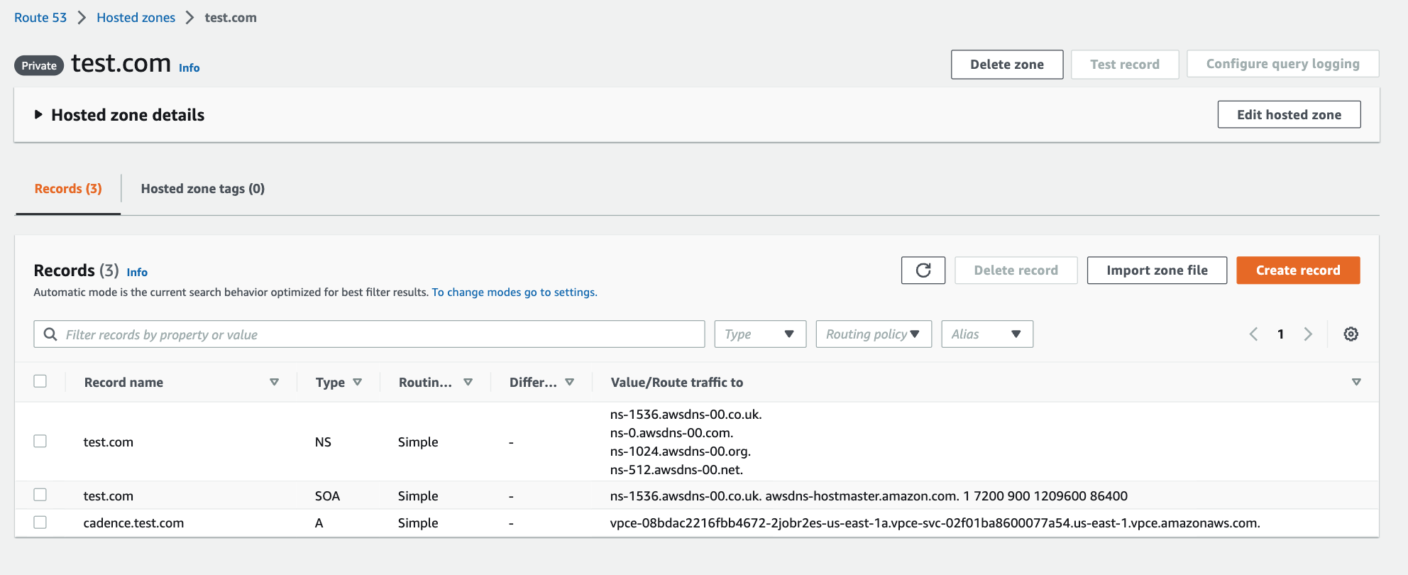 - You will be redirected to the created private hosted zone.